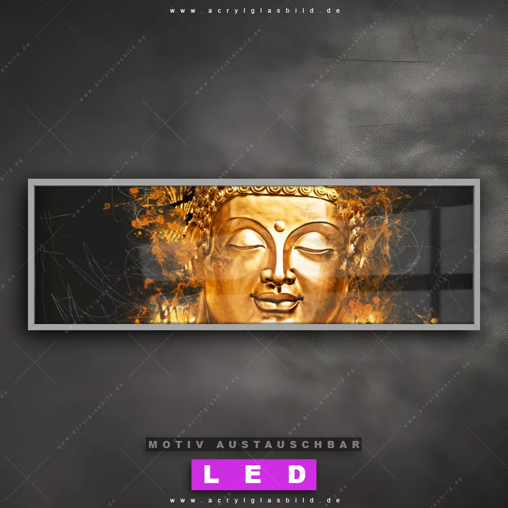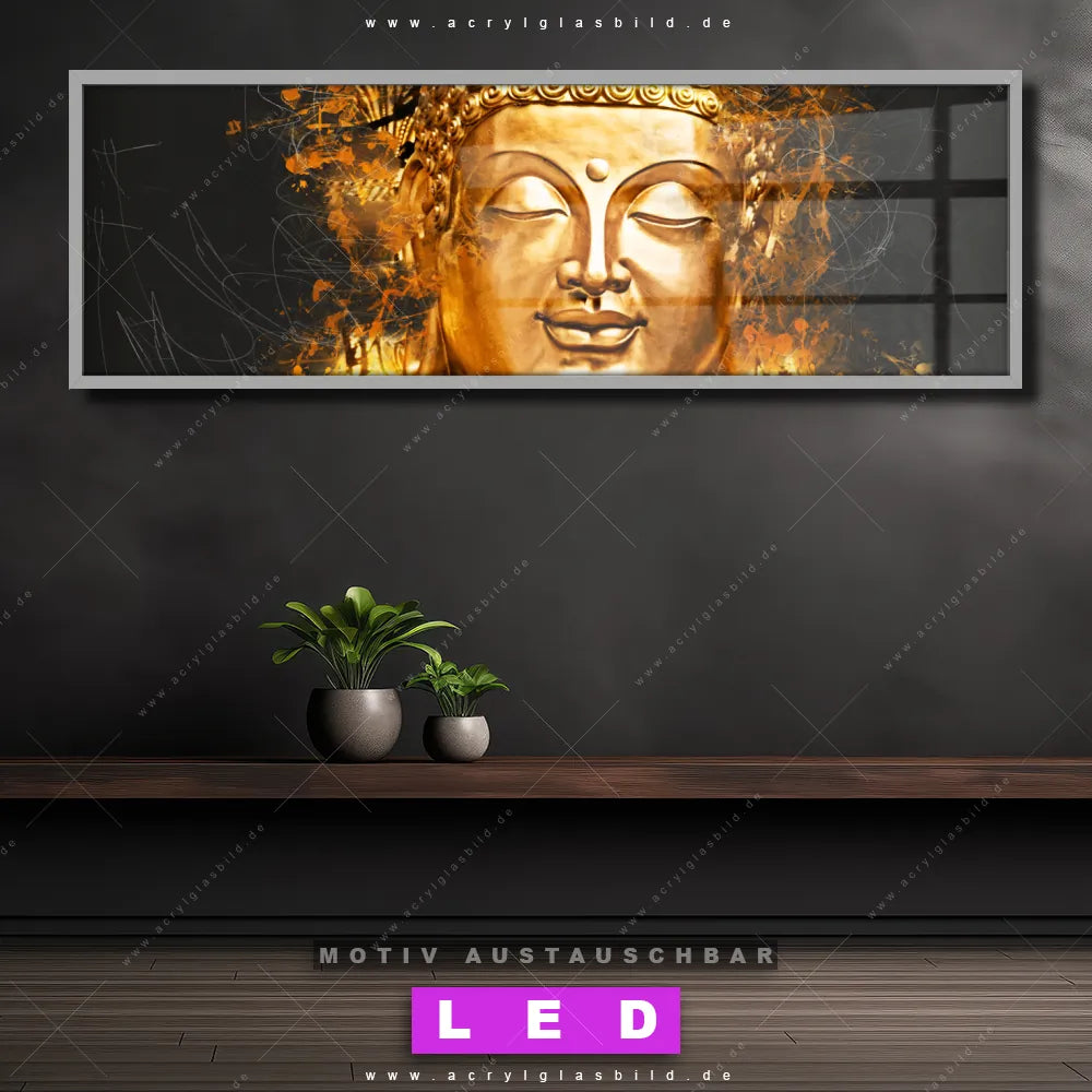 Deine Wände könnten dringend ein dimmbares LED Bild mit Fernbedienung und optionaler Farbtemperatursteuerung gebrauchen? Dann haben wir das perfekte Wandbild mit LED Beleuchtung für dich: unser mega-cooles Buddha - Feng Shui Canvalight® DIA LED Acrylglasbild! Mit unserem angesagten Leuchtbild aus Acrylglas im Panorama-Format und der austauschbaren bedruckten Acrylglas-Scheibe Buddha Golden Splash bringst du nicht nur Licht, sondern auch jede Menge Flair in deine Räume.