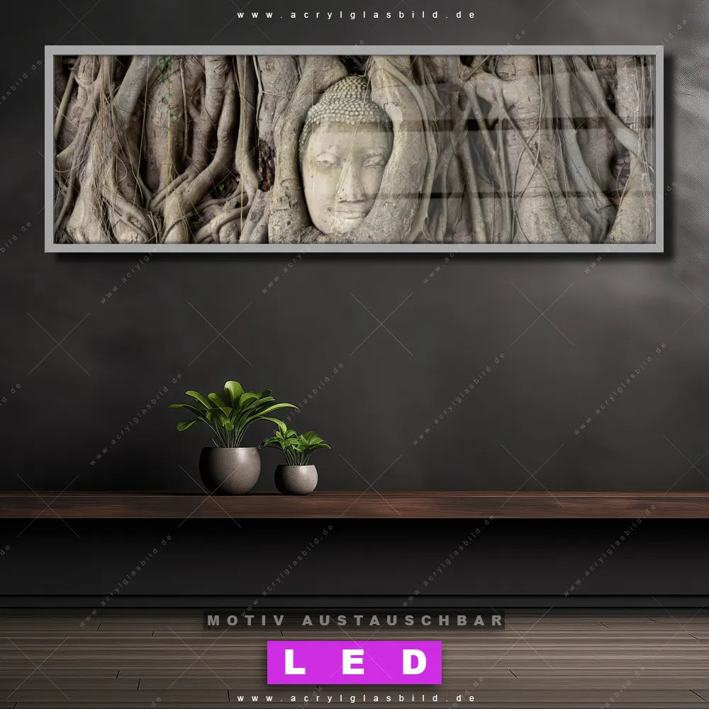 Deine Wände könnten dringend ein dimmbares LED Bild mit Fernbedienung und optionaler Farbtemperatursteuerung gebrauchen? Dann haben wir das perfekte Wandbild mit LED Beleuchtung für dich: unser mega-cooles Buddha - Feng Shui Canvalight® DIA LED Acrylglasbild! Mit unserem angesagten Leuchtbild aus Acrylglas im Panorama-Format und der austauschbaren bedruckten Acrylglas-Scheibe Buddha in Baumwurzeln bringst du nicht nur Licht, sondern auch jede Menge Flair in deine Räume.