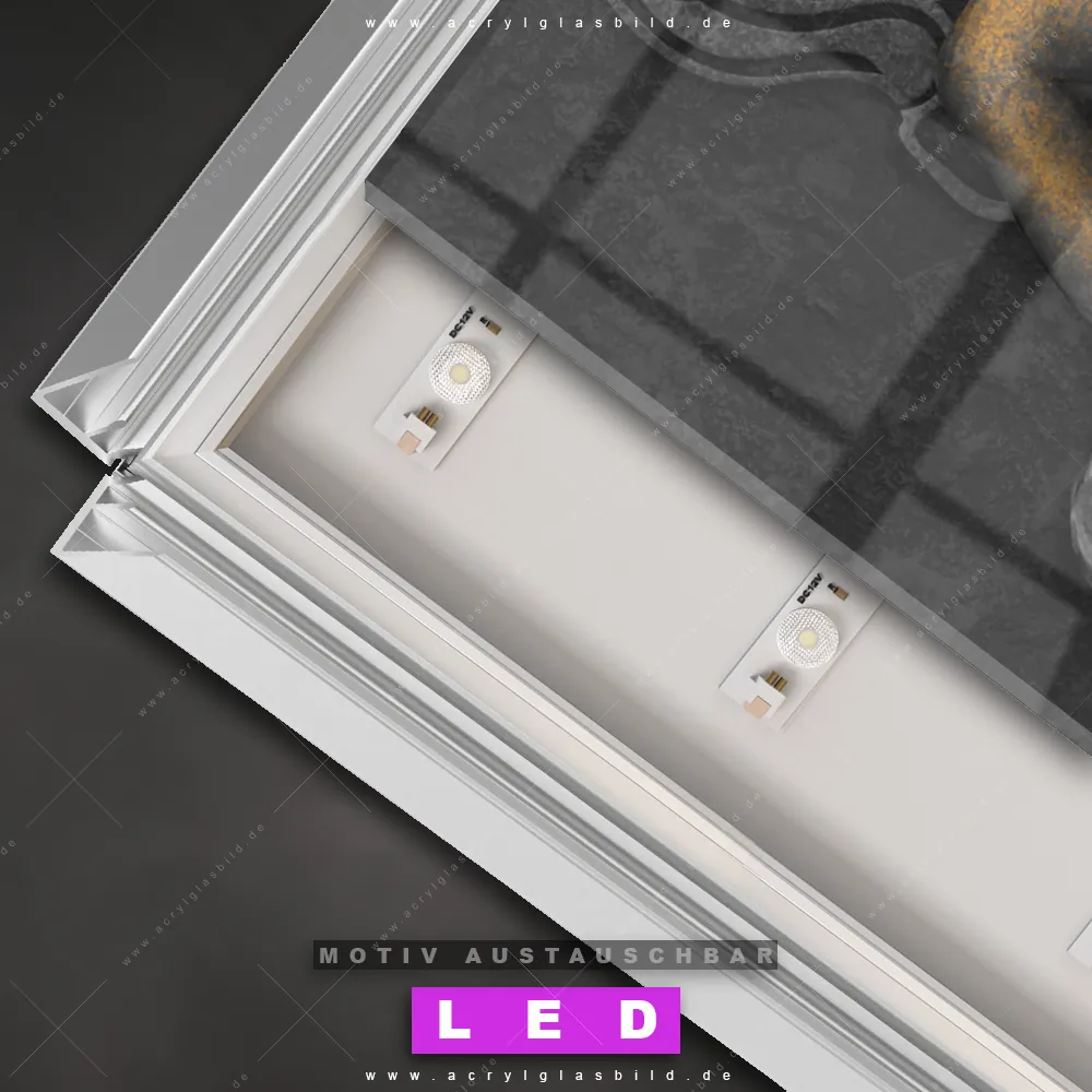 Du bist auf der Suche nach einem dimmbaren Buddha - Feng Shui LED Bild mit Fernbedienung und optionaler Farbtemperatursteuerung? Dann haben wir hier genau das richtige Wandbild mit LED Beleuchtung für dich: Unser Canvalight® DIA LED Acrylglasbild Buddha in Lotus Pose im Querformat mit austauschbarer bedruckter Acrylglas-Scheibe. Dieses Leuchtbild bringt sofort Partybeleuchtung in deine Räume!