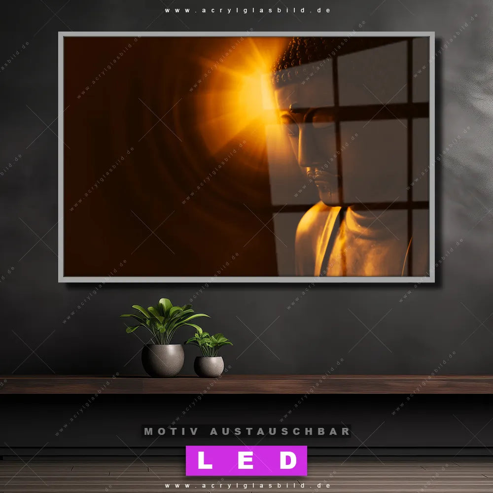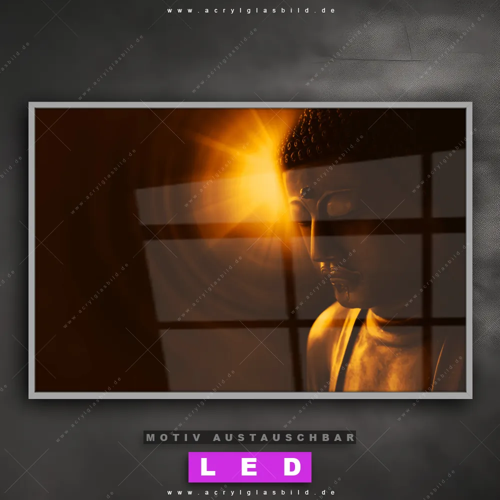 Du bist auf der Suche nach einem dimmbaren Buddha - Feng Shui LED Bild mit Fernbedienung und optionaler Farbtemperatursteuerung? Dann haben wir hier genau das richtige Wandbild mit LED Beleuchtung für dich: Unser Canvalight® DIA LED Acrylglasbild Buddha - Licht der Weisheit im Querformat mit austauschbarer bedruckter Acrylglas-Scheibe. Dieses Leuchtbild bringt sofort Partybeleuchtung in deine Räume!