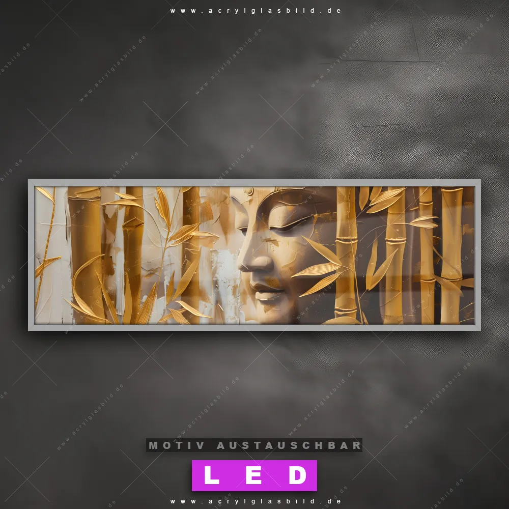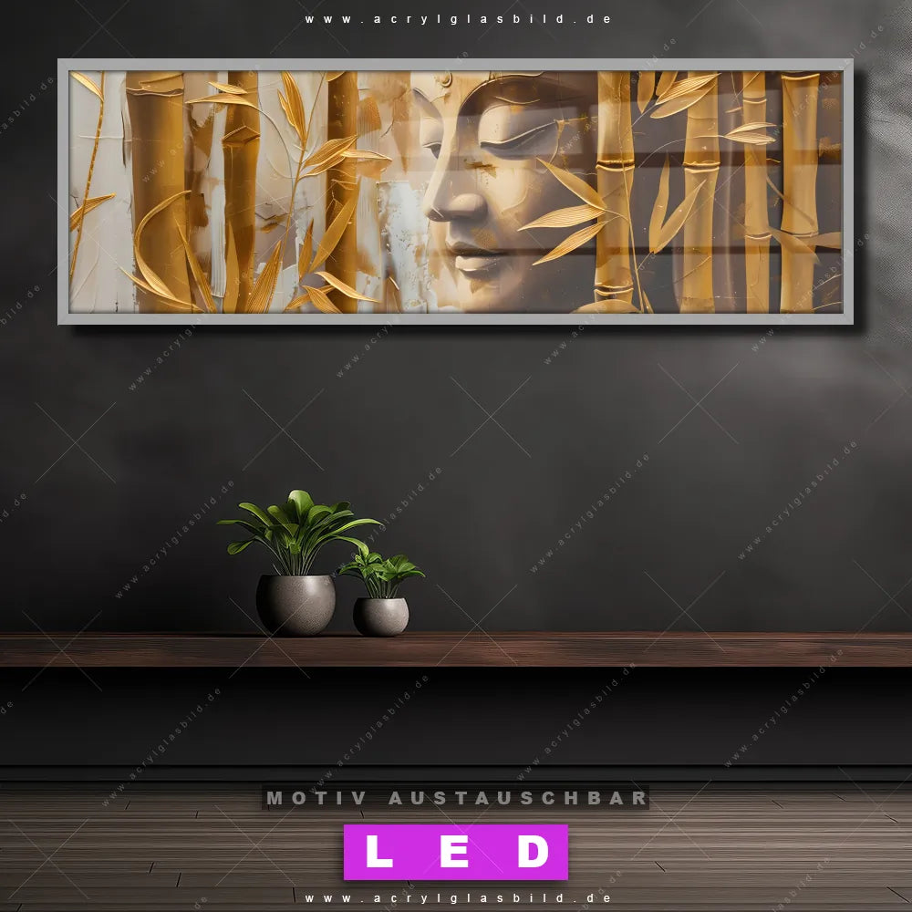 LED Acrylglasbild Canvalight® DIA | Buddha-Statue im goldenen Bambus | Panorama