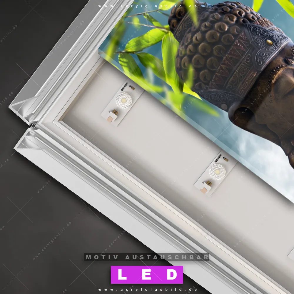 Du suchst nach einem Wandbild mit LED Beleuchtung als ultimativen Hingucker für deine Wände? Dann haben wir das perfekte dimmbare LED Bild mit Fernbedienung und optionaler Farbtemperatursteuerung für dich: unser abgefahrenes Buddha - Feng Shui Canvalight® DIA LED Acrylglasbild! Mit dem LED Leuchtbild aus Acrylglas Buddha Statue mit Seerose im Hochformat mit austauschbarer bedruckter Acrylglas-Scheibe bringst du nicht nur Licht, sondern auch ordentlich Stil in deine Bude.