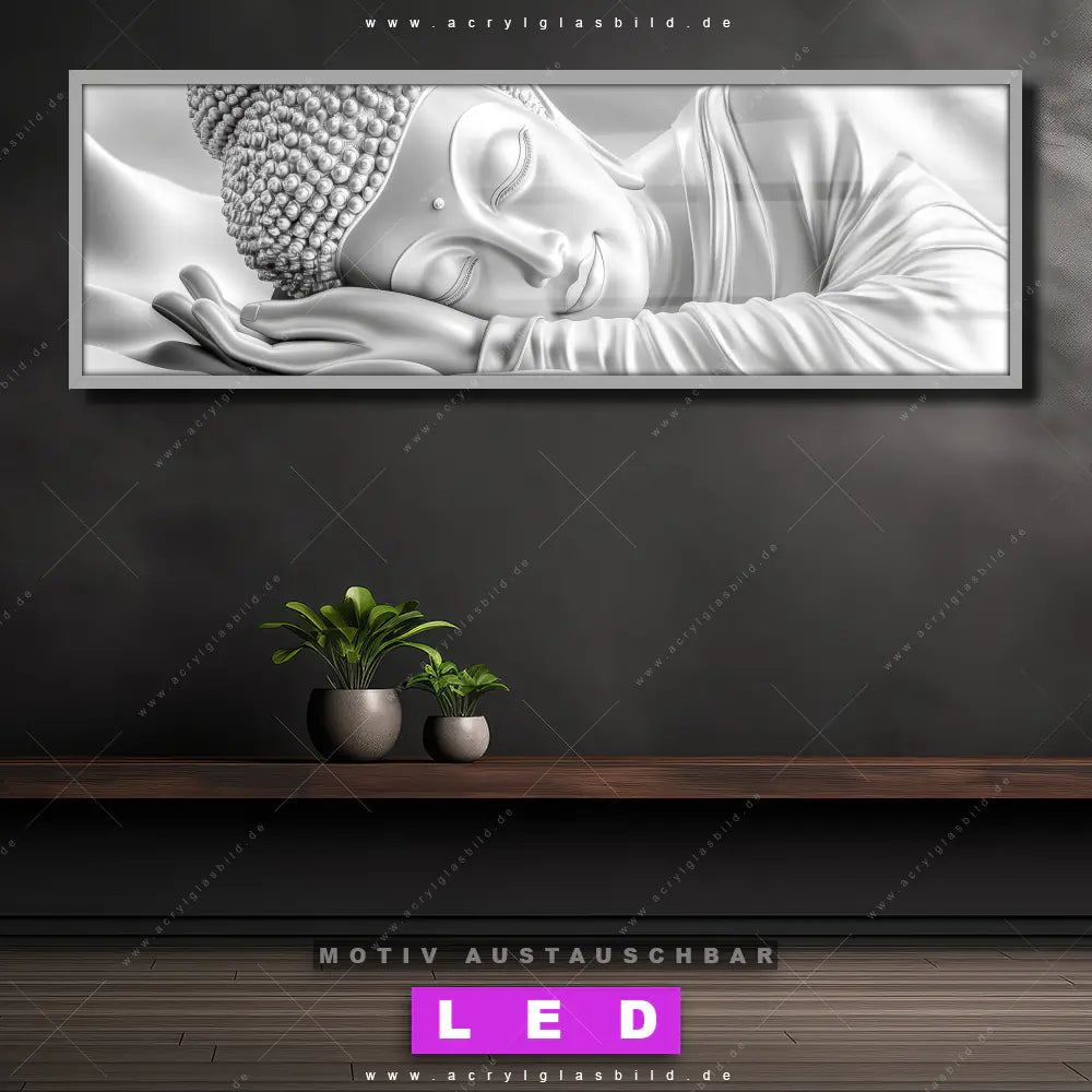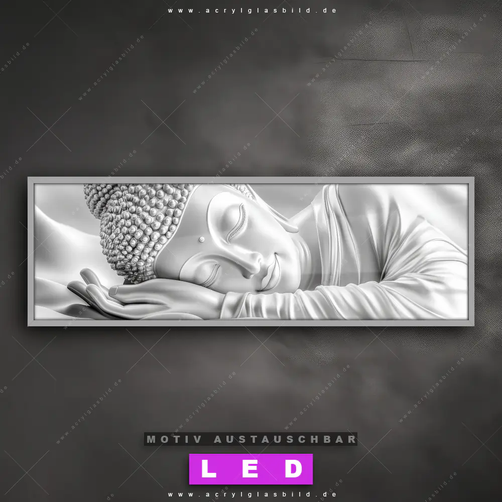 Wer will schon dunkle, triste Wände? Mit unserem LED Acrylglasbild Canvalight® DIA Ruhender Buddha in Silber und seiner fantastischen LED-Ausleuchtung werden deine Wände in Arzt - Praxis, Wohnzimmer - Schlafzimmer, Flur - Eingangsbereich zu echten Hinguckern. Wenn du auf der Suche nach einem beleuchteten Wandbild aus Acrylglas mit Buddha, Buddhismus, Religion, Feng Shui, Zen, Meditation, spirituell, heilig, Esoterik, Gott, Statue bist, dann solltest du unser LED Leuchhtbild Buddha - Traum der inneren Balance mit den beeindruckenden Motiv-Farben Weiss, Grau , Silber nicht verpassen. Gestaltet im angesagten Modern Art Stil, passt das LED Bild mit DIA-Klapprahmen und wechselbarer Acrylglas-Scheibe perfekt zu jedem Einrichtungsstil – selbst in deinem kleinen Dschungel aus Kreativität und Chaos!