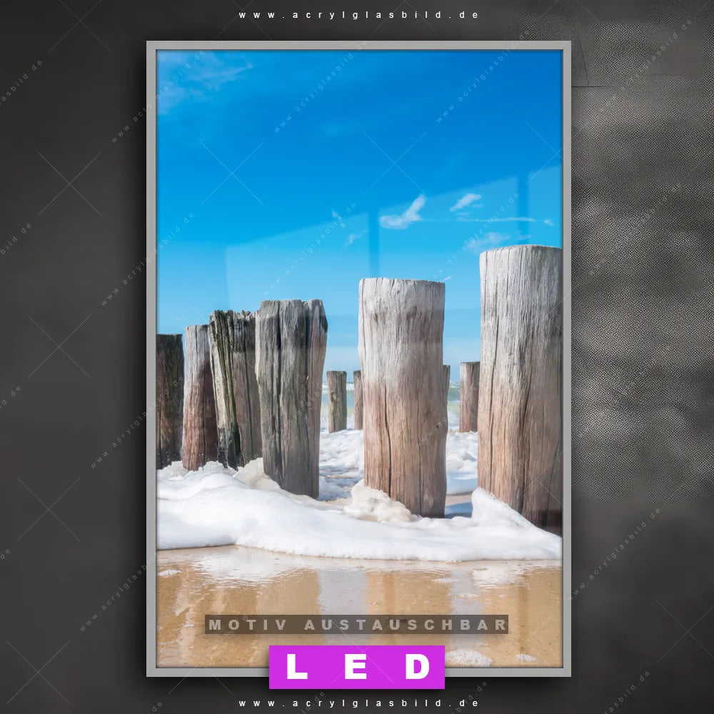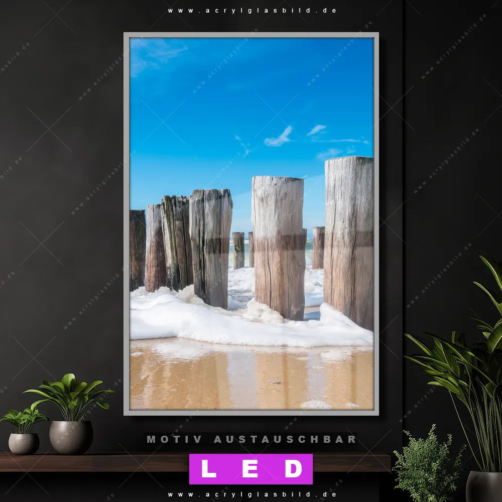 Du suchst nach einem Wandbild mit LED Beleuchtung als ultimativen Hingucker für deine Wände? Dann haben wir das perfekte dimmbare LED Bild mit Fernbedienung und optionaler Farbtemperatursteuerung für dich: unser abgefahrenes Strand - Meer, Landschaften Canvalight® DIA LED Acrylglasbild! Mit dem LED Leuchtbild aus Acrylglas Buhnen in Wellen am Strand im Hochformat mit austauschbarer bedruckter Acrylglas-Scheibe bringst du nicht nur Licht, sondern auch ordentlich Stil in deine Bude.