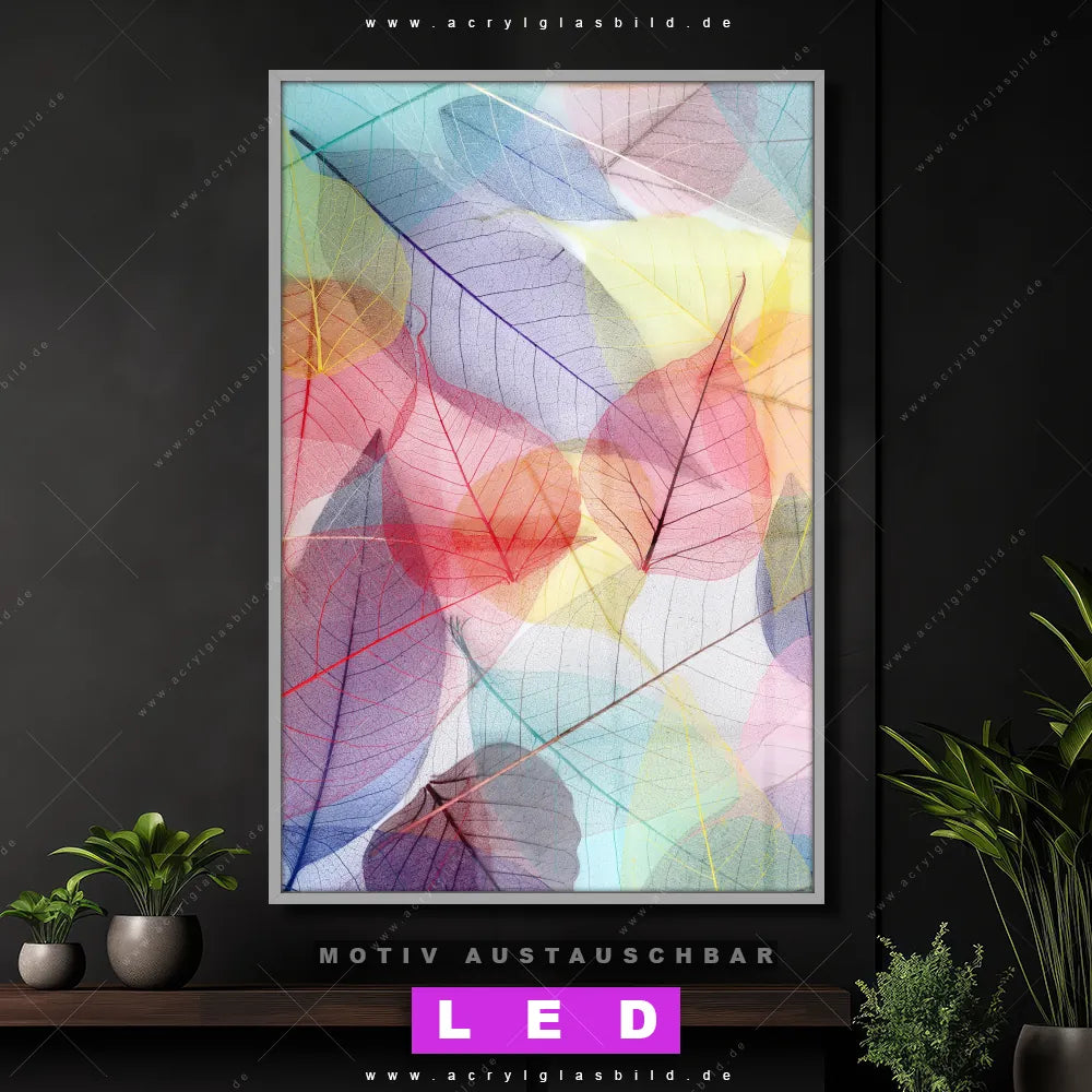 Du suchst nach einem Wandbild mit LED Beleuchtung als ultimativen Hingucker für deine Wände? Dann haben wir das perfekte dimmbare LED Bild mit Fernbedienung und optionaler Farbtemperatursteuerung für dich: unser abgefahrenes Muster - Texturen, Blumen - Botanik Canvalight® DIA LED Acrylglasbild! Mit dem LED Leuchtbild aus Acrylglas Bunte Blätter im Hochformat mit austauschbarer bedruckter Acrylglas-Scheibe bringst du nicht nur Licht, sondern auch ordentlich Stil in deine Bude.