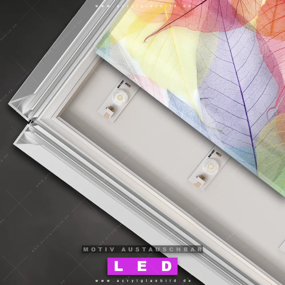 Also, worauf wartest du noch? Gib mit einem beleuchteten Wandbild mit wechselbarer Acrylglas-Scheibe deinen Wänden das gewisse Etwas und bestelle jetzt das LED Acrylglasbild Canvalight® DIA Bunte Blattvielfalt – dein Zuhause wird es dir danken und deine Freunde werden dank der wechselbaren Motive erblassen!