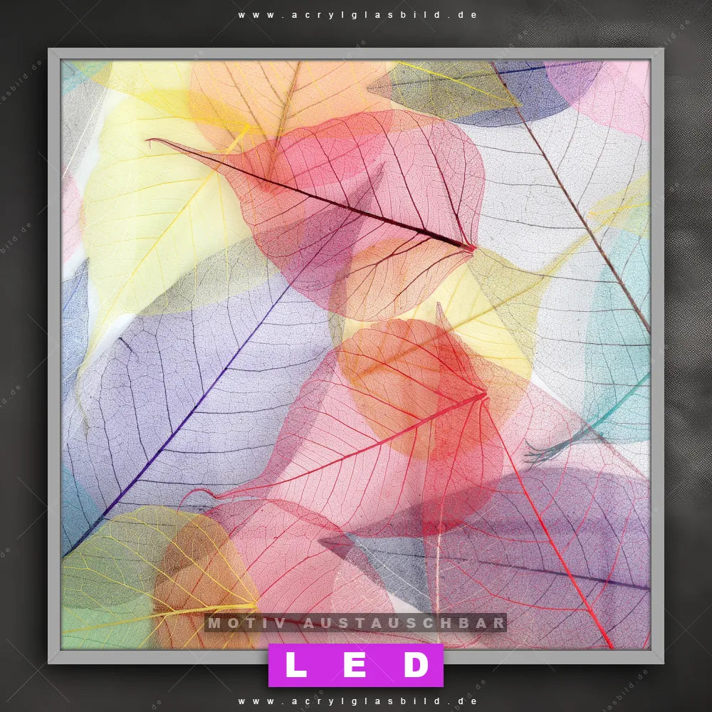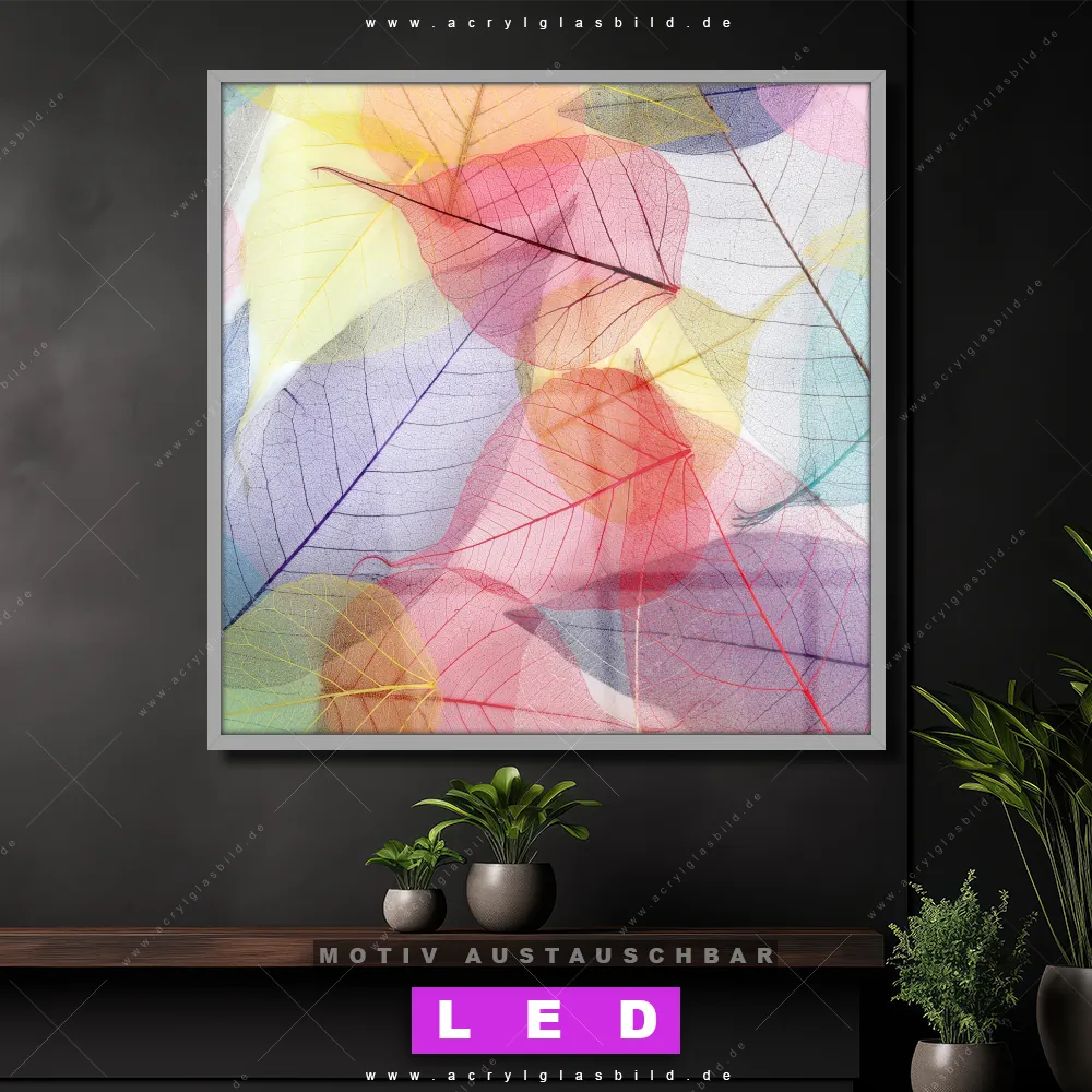 Bist du bereit, deine Wände mit einem dimmbaren LED Bild mit Fernbedienung und optionaler Farbtemperatursteuerung zum Leuchten zu bringen? Wir haben das ultimative Muster - Texturen, Blumen - Botanik LED Acrylglasbild Canvalight® DIA für dich! Unser LED Wandbild aus Acrylglas Bunte Blätter im Quadratischen Format mit austauschbarer bedruckter Acrylglas-Scheibe im DIA-Klapprahmen bringt sofort jede Menge Glanz in deine vier Wände.