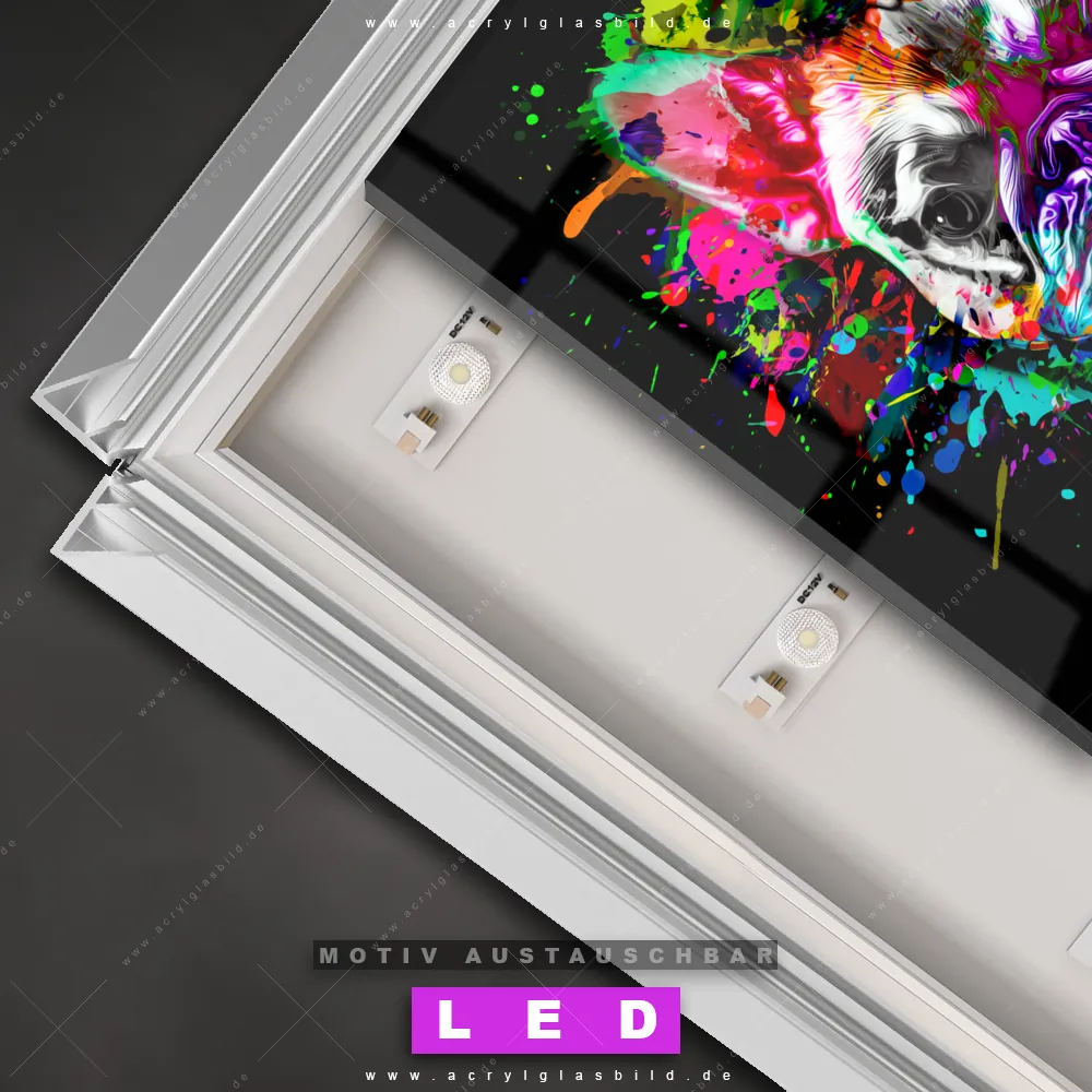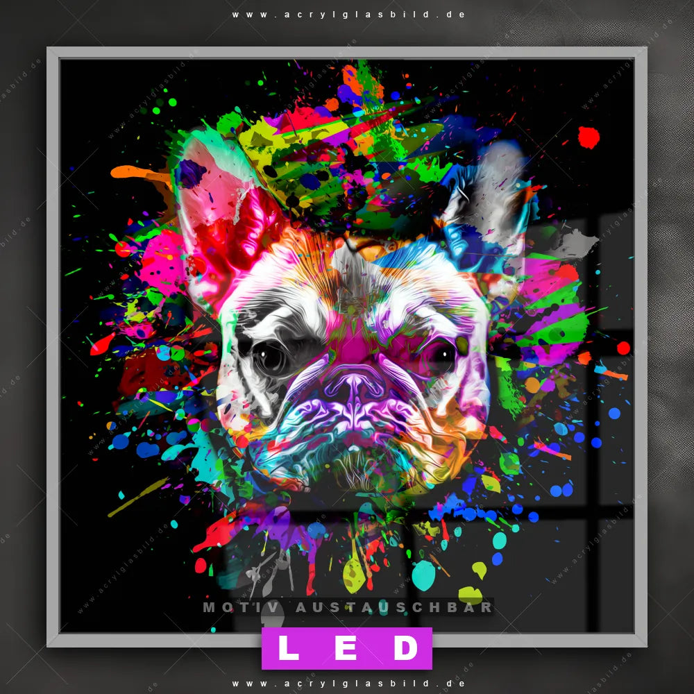 Also, worauf wartest du noch? Gib mit einem beleuchteten Wandbild mit wechselbarer Acrylglas-Scheibe deinen Wänden das gewisse Etwas und bestelle jetzt das LED Acrylglasbild Canvalight® DIA Bulldogge mit abstrakten Farbspritzern – dein Zuhause wird es dir danken und deine Freunde werden dank der wechselbaren Motive erblassen!