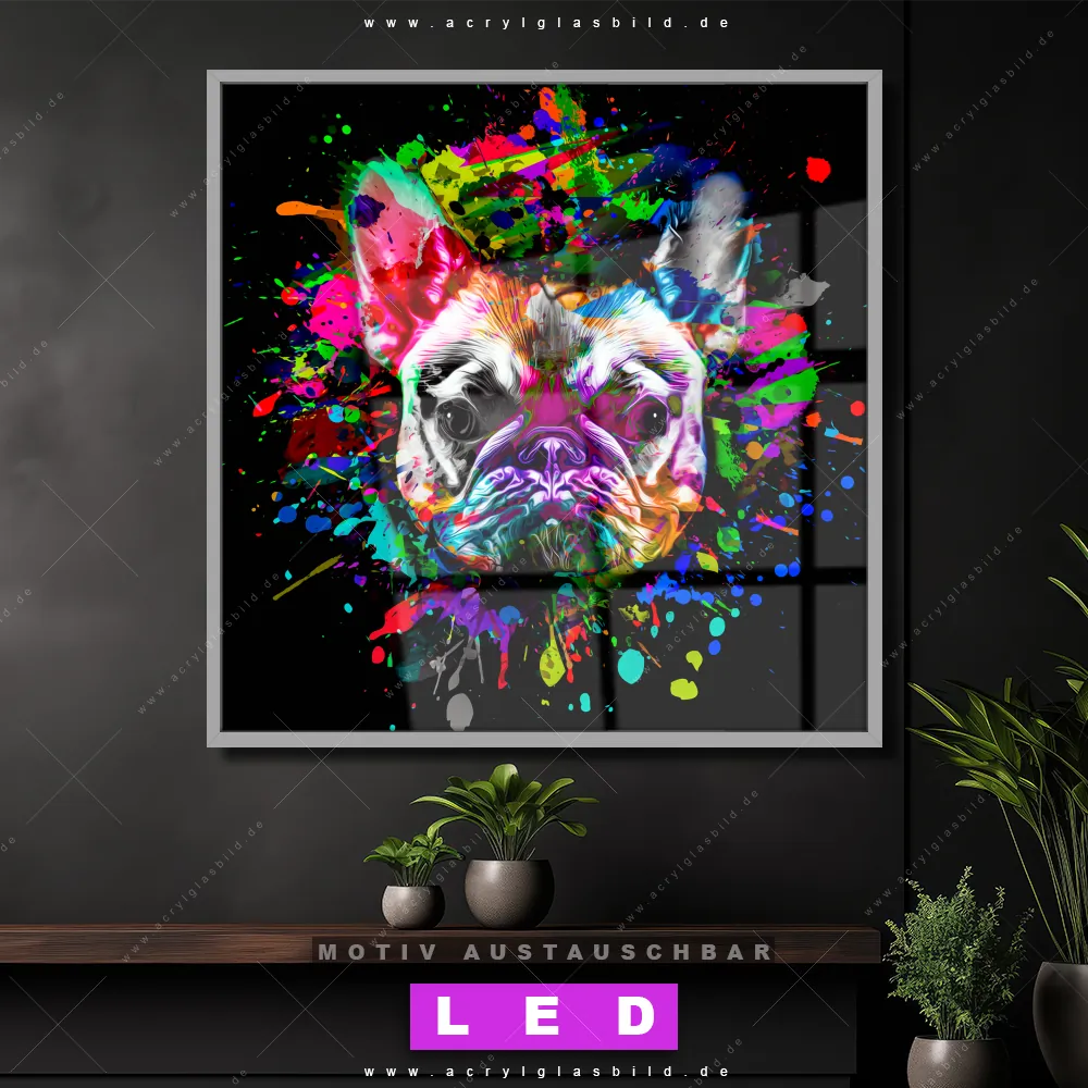 Bist du bereit, deine Wände mit einem dimmbaren LED Bild mit Fernbedienung und optionaler Farbtemperatursteuerung zum Leuchten zu bringen? Wir haben das ultimative Tierwelt LED Acrylglasbild Canvalight® DIA für dich! Unser LED Wandbild aus Acrylglas Bunte Bulldogge Schwarz im Quadratischen Format mit austauschbarer bedruckter Acrylglas-Scheibe im DIA-Klapprahmen bringt sofort jede Menge Glanz in deine vier Wände.