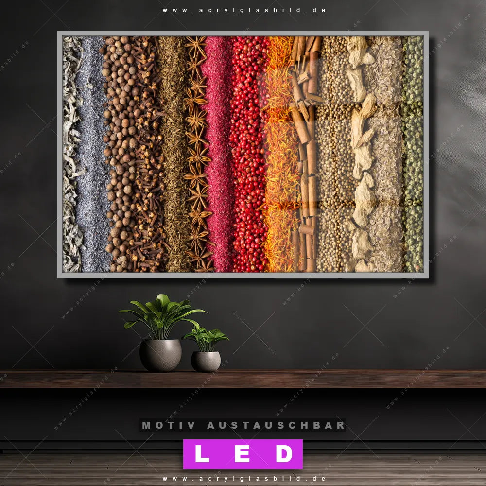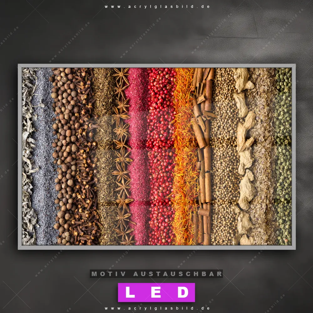Du bist auf der Suche nach einem dimmbaren Essen - Trinken LED Bild mit Fernbedienung und optionaler Farbtemperatursteuerung? Dann haben wir hier genau das richtige Wandbild mit LED Beleuchtung für dich: Unser Canvalight® DIA LED Acrylglasbild Bunte Gewürze im Querformat mit austauschbarer bedruckter Acrylglas-Scheibe. Dieses Leuchtbild bringt sofort Partybeleuchtung in deine Räume!