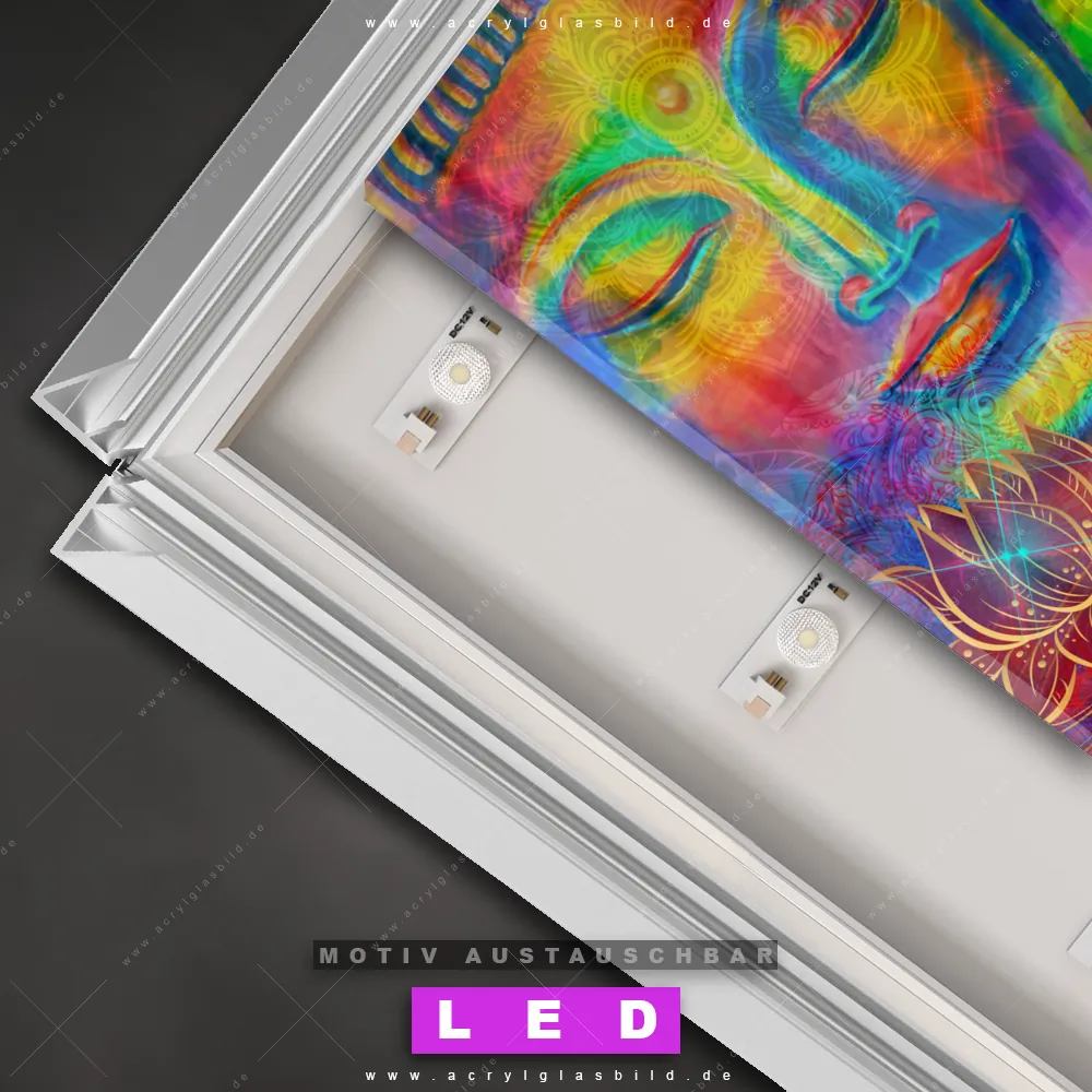 Also, worauf wartest du noch? Gib mit einem beleuchteten Wandbild mit wechselbarer Acrylglas-Scheibe deinen Wänden das gewisse Etwas und bestelle jetzt das LED Acrylglasbild Canvalight® DIA Buddha und Blüten in intensiven Farben – dein Zuhause wird es dir danken und deine Freunde werden dank der wechselbaren Motive erblassen!