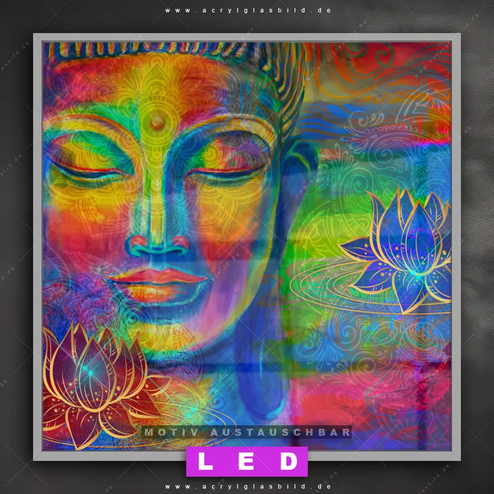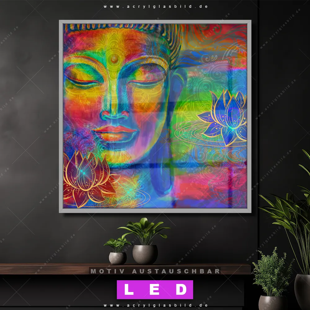 Vergiss dunkle Ecken und Langeweile! Mit unserem Acrylglasbild farbenfroher Buddha und seiner brillanten LED-Ausleuchtung wirst du dich nie wieder in der Dunkelheit verirren. Wenn du auf der Suche nach einem beleuchteten Wandbild aus Acrylglas mit Buddha, Buddhismus, Religion, Feng Shui, Zen, Meditation, Lotus, Blüte bist, ist unser LED Acrylglasbild Canvalight® DIA Buddha mit Lotusblüten mit den strahlenden Motiv-Farben Bunt, Gold genau das richtige Leuchtbild für dich. Das im Mixed Media, Modern Art, Pop Art Stil gestaltete LED Bild mit glänzender Front aus Acrylglas passt perfekt zu jedem Einrichtungsstil in Arzt - Praxis, Wohnzimmer - Schlafzimmer, Büro - Kanzlei, Flur - Eingangsbereich – vom minimalistischen Chic bis zum kreativen Chaos.