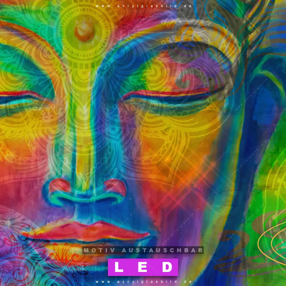 Du bist auf der Suche nach einem dimmbaren Buddha - Feng Shui LED Bild mit Fernbedienung und optionaler Farbtemperatursteuerung? Dann haben wir hier genau das richtige Wandbild mit LED Beleuchtung für dich: Unser Canvalight® DIA LED Acrylglasbild Bunter Buddha No.2 im Querformat mit austauschbarer bedruckter Acrylglas-Scheibe. Dieses Leuchtbild bringt sofort Partybeleuchtung in deine Räume!