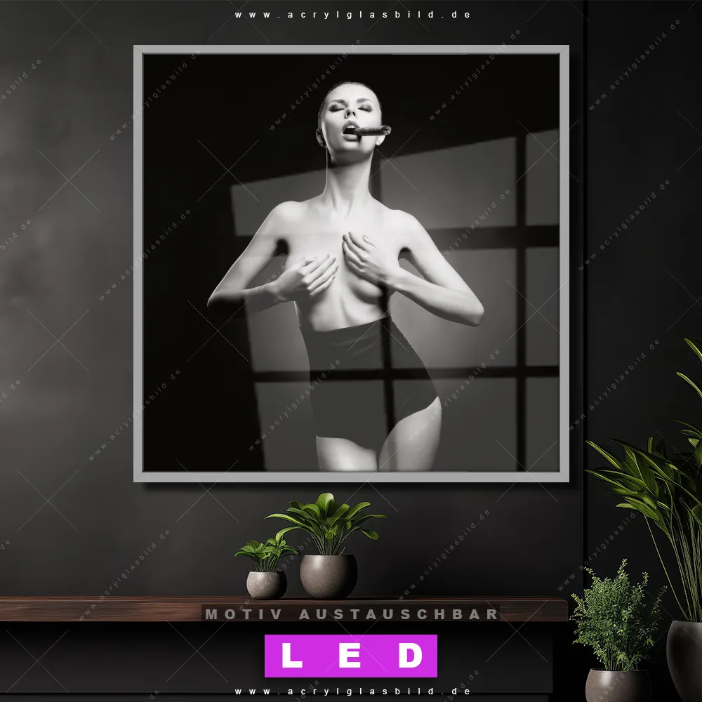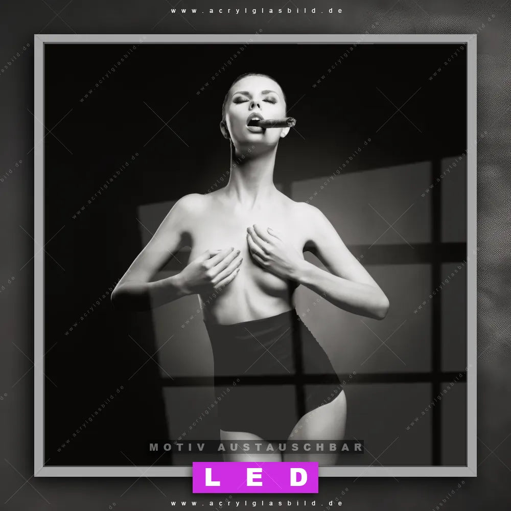 Bist du bereit, deine Wände mit einem dimmbaren LED Bild mit Fernbedienung und optionaler Farbtemperatursteuerung zum Leuchten zu bringen? Wir haben das ultimative Erotik - Akt LED Acrylglasbild Canvalight® DIA für dich! Unser LED Wandbild aus Acrylglas Dame mit Zigarre im Quadratischen Format mit austauschbarer bedruckter Acrylglas-Scheibe im DIA-Klapprahmen bringt sofort jede Menge Glanz in deine vier Wände.
