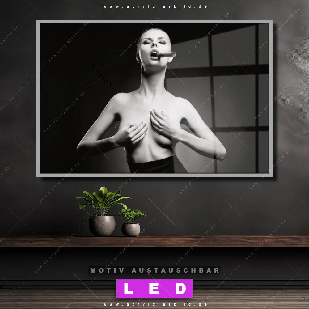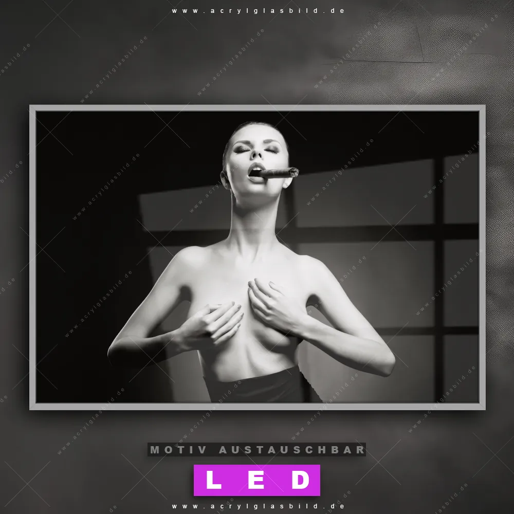 Du bist auf der Suche nach einem dimmbaren Erotik - Akt LED Bild mit Fernbedienung und optionaler Farbtemperatursteuerung? Dann haben wir hier genau das richtige Wandbild mit LED Beleuchtung für dich: Unser Canvalight® DIA LED Acrylglasbild Dame mit Zigarre im Querformat mit austauschbarer bedruckter Acrylglas-Scheibe. Dieses Leuchtbild bringt sofort Partybeleuchtung in deine Räume!