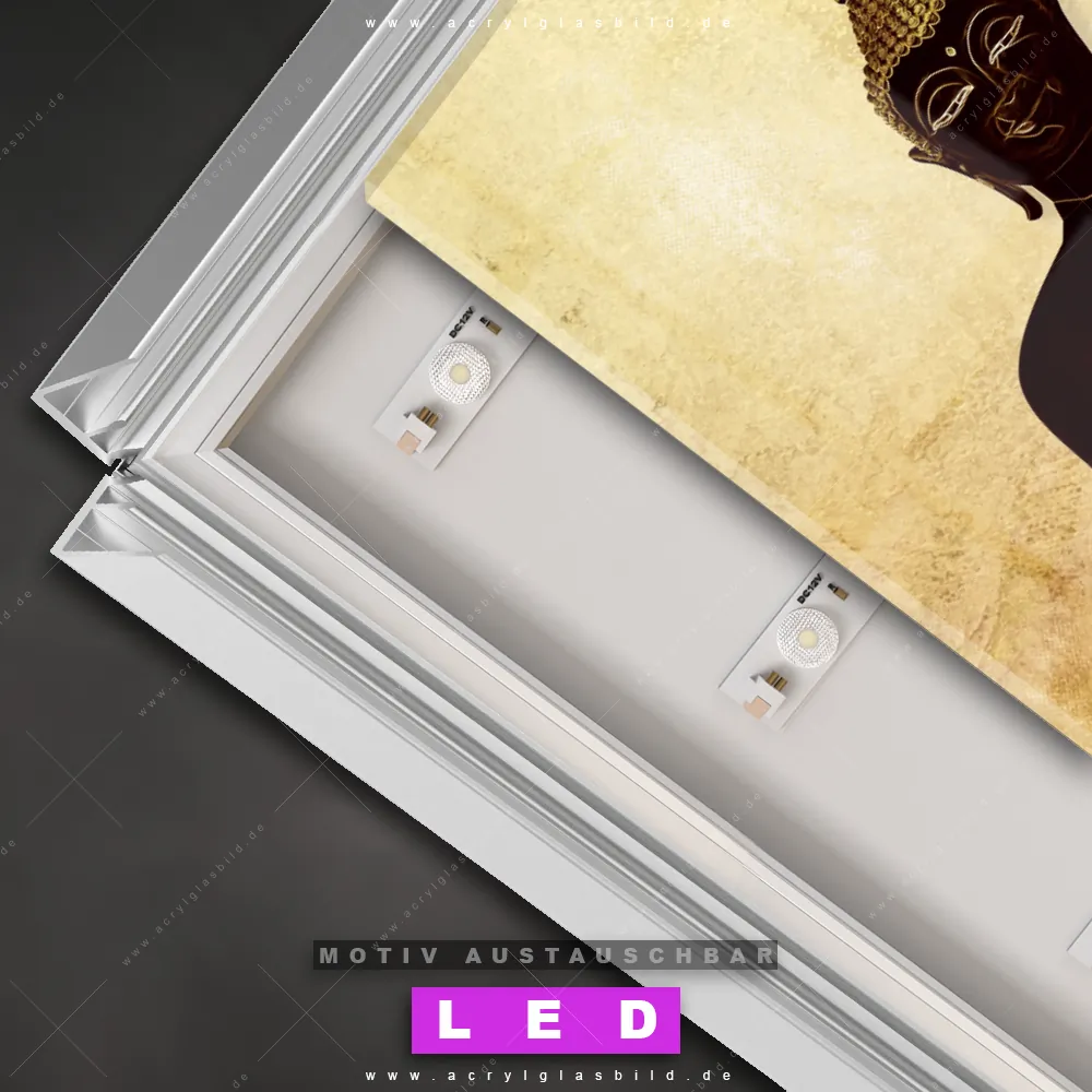 Du suchst nach einem Wandbild mit LED Beleuchtung als ultimativen Hingucker für deine Wände? Dann haben wir das perfekte dimmbare LED Bild mit Fernbedienung und optionaler Farbtemperatursteuerung für dich: unser abgefahrenes Buddha - Feng Shui Canvalight® DIA LED Acrylglasbild! Mit dem LED Leuchtbild aus Acrylglas Dark Buddha im Hochformat mit austauschbarer bedruckter Acrylglas-Scheibe bringst du nicht nur Licht, sondern auch ordentlich Stil in deine Bude.