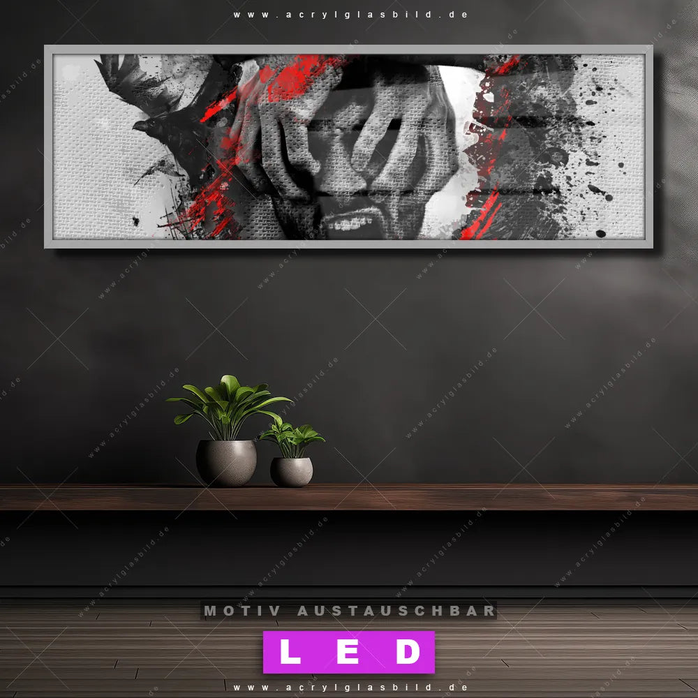 Wer will schon dunkle, triste Wände? Mit unserem LED Acrylglasbild Canvalight® DIA Kraftvolles Gesicht mit Vogelsilhouetten und seiner fantastischen LED-Ausleuchtung werden deine Wände in Bar - Gastronomie, Büro - Kanzlei, Flur - Eingangsbereich, Wohnzimmer - Schlafzimmer zu echten Hinguckern. Wenn du auf der Suche nach einem beleuchteten Wandbild aus Acrylglas mit Vögel, Raben, Krähen, Grunge, Streetart, modern, Porträt, Mann, Gesicht bist, dann solltest du unser LED Leuchhtbild Kontraste der Seele mit den beeindruckenden Motiv-Farben Weiss, Schwarz, Rot nicht verpassen. Gestaltet im angesagten Grunge, Mixed Media, Modern Art, Schwarz - Weiss Stil, passt das LED Bild mit DIA-Klapprahmen und wechselbarer Acrylglas-Scheibe perfekt zu jedem Einrichtungsstil – selbst in deinem kleinen Dschungel aus Kreativität und Chaos!