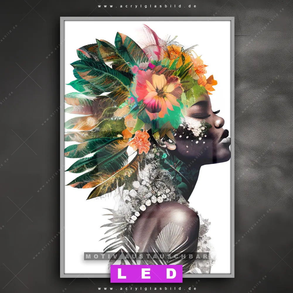 Begriffe wie Menschen & Blumen, Frau, Porträt, Beauty, Gesicht, Blumen, Blüten, Blätter, Afrika haben dich auf der Suche nach deinem neuen LED Wandbild aus Acrylglas inspiriert? Dann sollte das LED Acrylglasbild Frau in Blütenpracht den Weg zu dir finden.