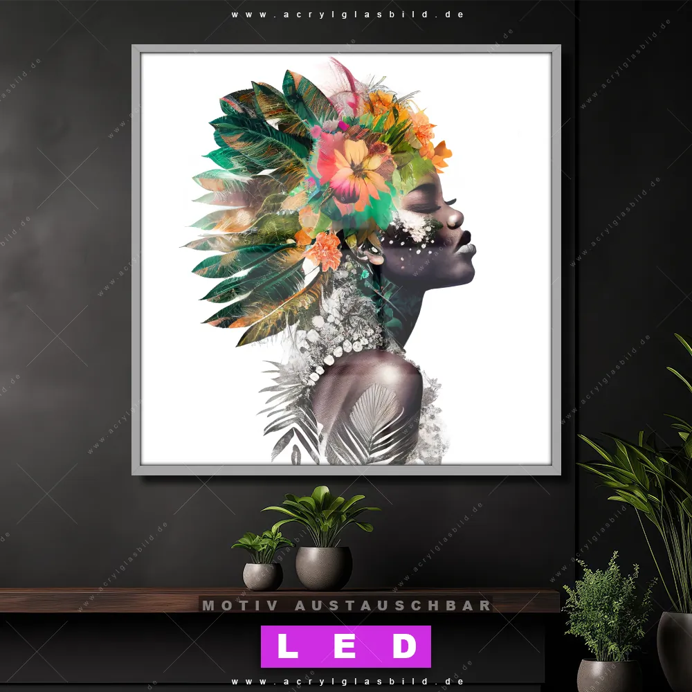 Bist du bereit, deine Wände mit einem dimmbaren LED Bild mit Fernbedienung und optionaler Farbtemperatursteuerung zum Leuchten zu bringen? Wir haben das ultimative Porträts - Menschen, Blumen - Botanik LED Acrylglasbild Canvalight® DIA für dich! Unser LED Wandbild aus Acrylglas Doppelbelichtung Porträt einer afrikanischen Frau im Quadratischen Format mit austauschbarer bedruckter Acrylglas-Scheibe im DIA-Klapprahmen bringt sofort jede Menge Glanz in deine vier Wände.
