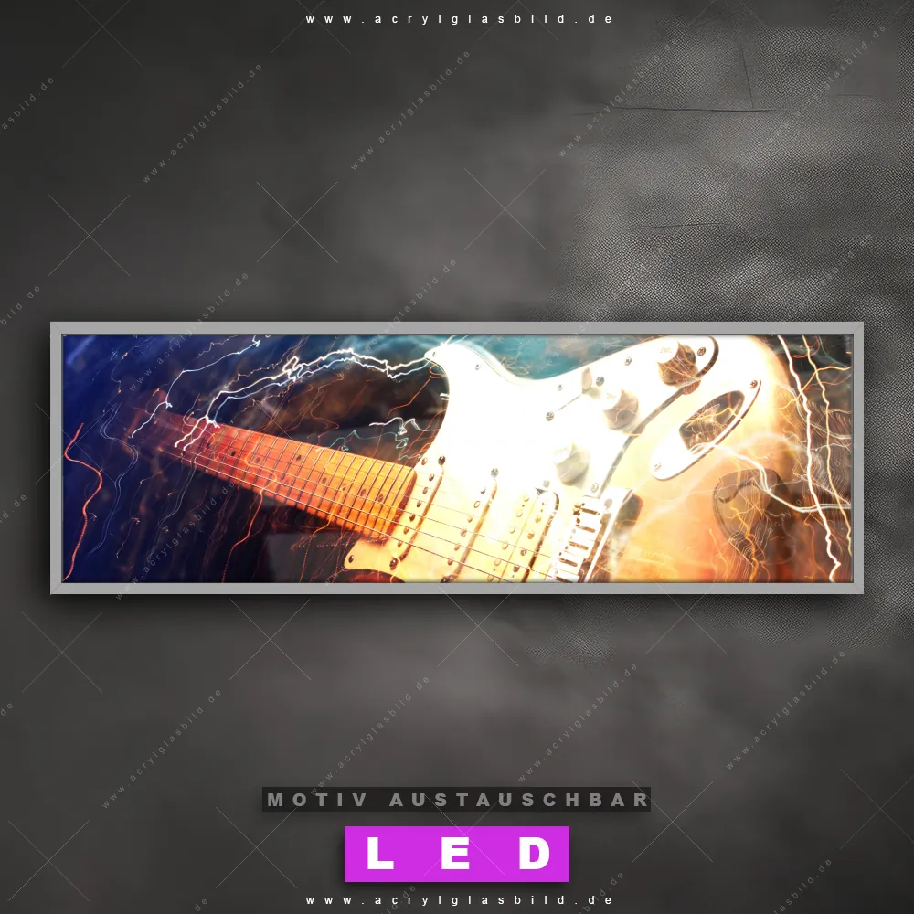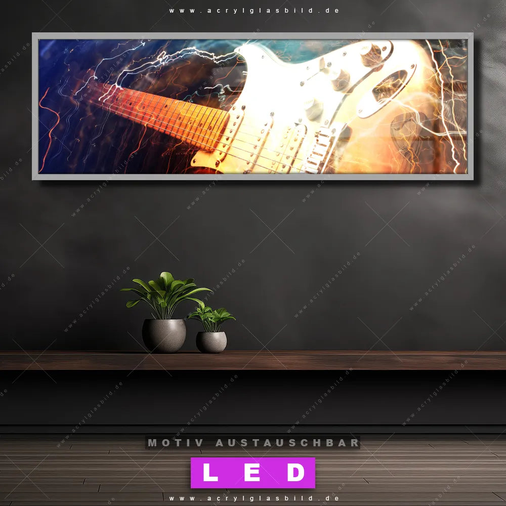 Deine Wände könnten dringend ein dimmbares LED Bild mit Fernbedienung und optionaler Farbtemperatursteuerung gebrauchen? Dann haben wir das perfekte Wandbild mit LED Beleuchtung für dich: unser mega-cooles Sport - Freizeit Canvalight® DIA LED Acrylglasbild! Mit unserem angesagten Leuchtbild aus Acrylglas im Panorama-Format und der austauschbaren bedruckten Acrylglas-Scheibe E-Gitarre bringst du nicht nur Licht, sondern auch jede Menge Flair in deine Räume.