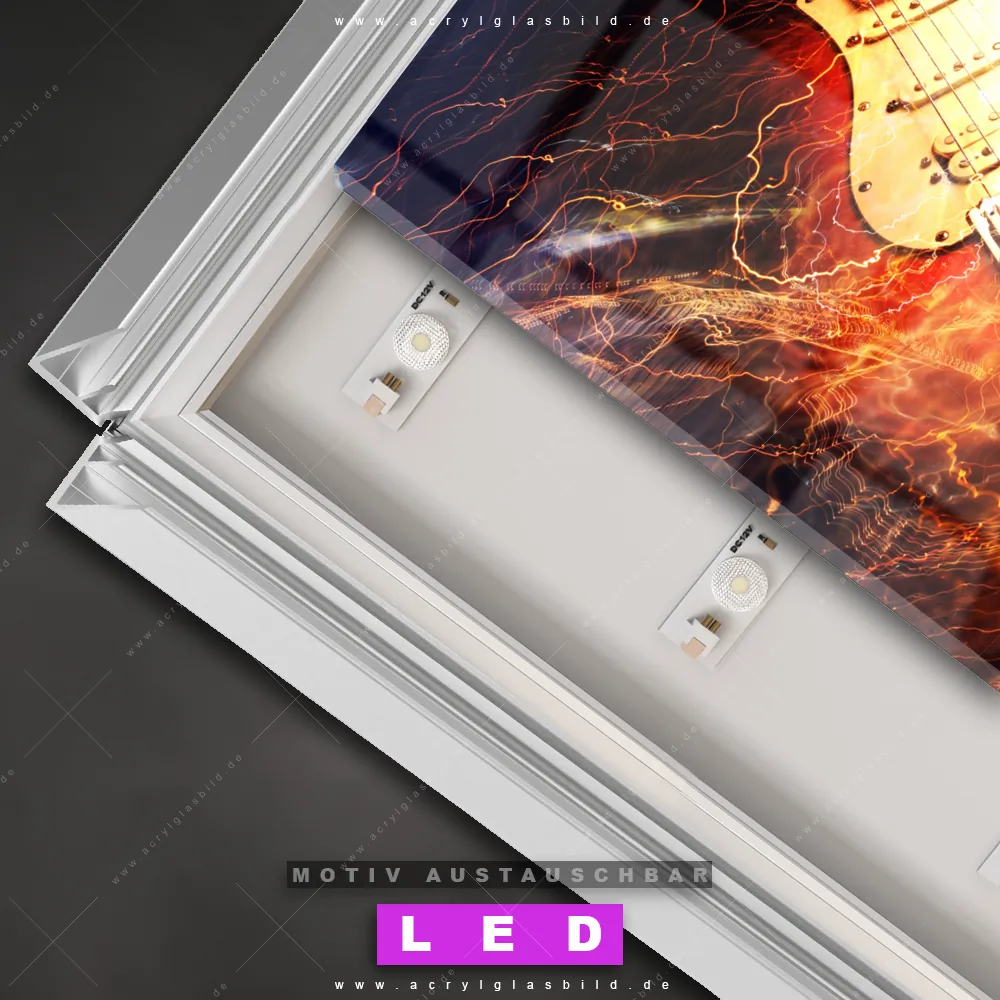 Also, worauf wartest du noch? Gib mit einem beleuchteten Wandbild mit wechselbarer Acrylglas-Scheibe deinen Wänden das gewisse Etwas und bestelle jetzt das LED Acrylglasbild Canvalight® DIA elektrische Gitarre – dein Zuhause wird es dir danken und deine Freunde werden dank der wechselbaren Motive erblassen!