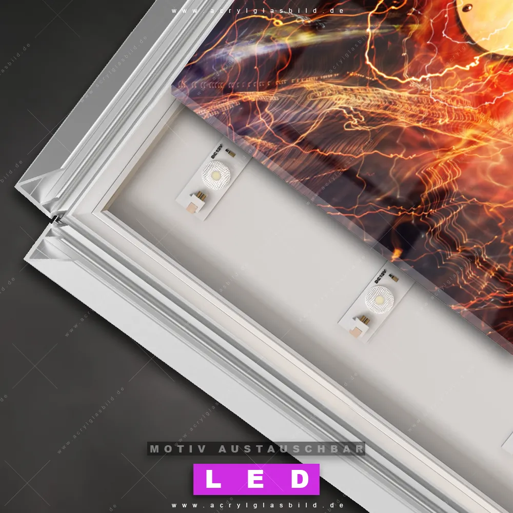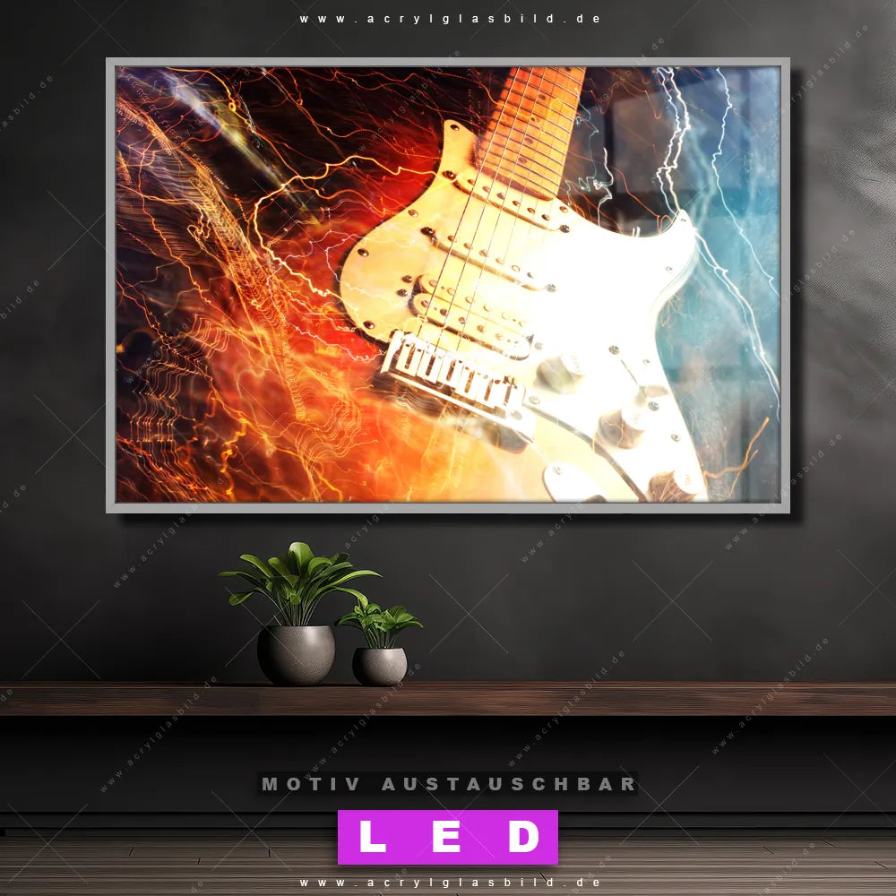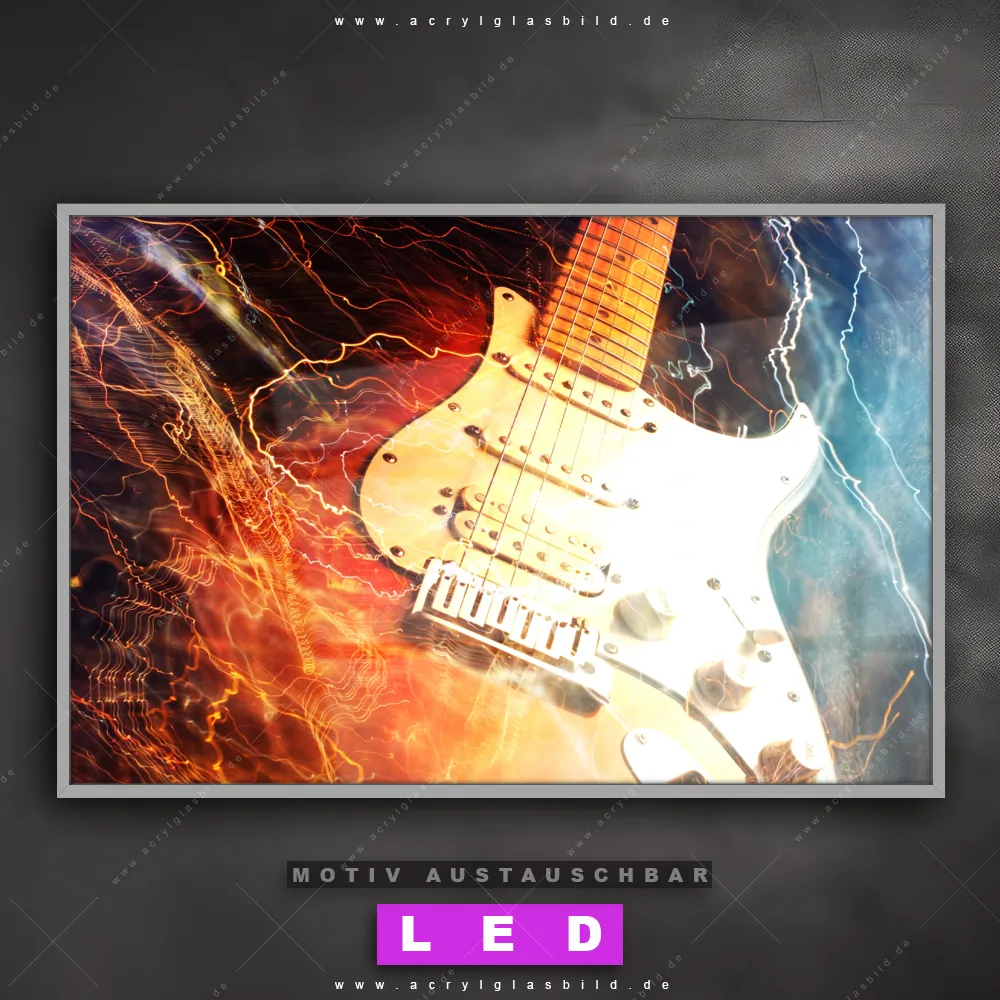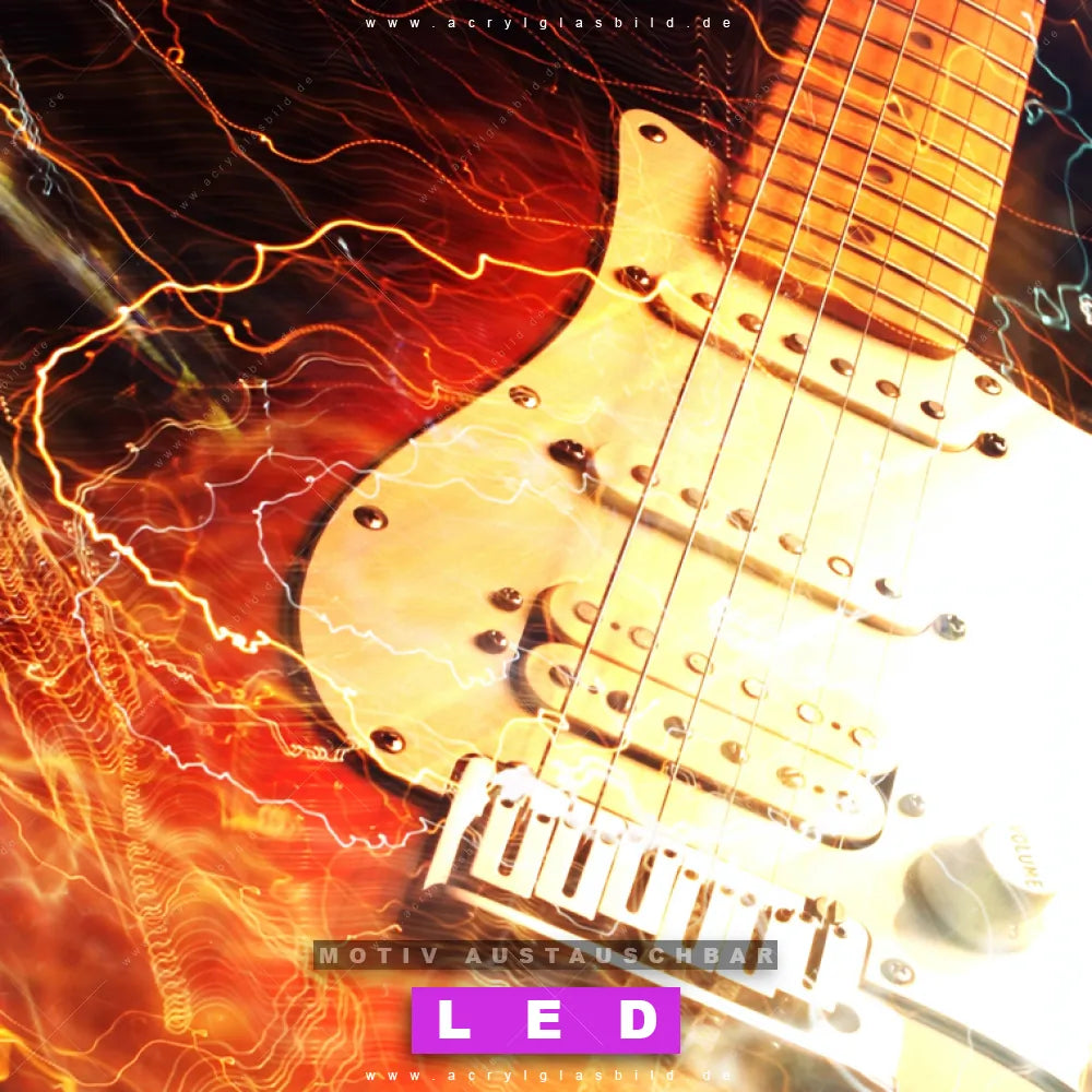 Du bist auf der Suche nach einem dimmbaren Sport - Freizeit LED Bild mit Fernbedienung und optionaler Farbtemperatursteuerung? Dann haben wir hier genau das richtige Wandbild mit LED Beleuchtung für dich: Unser Canvalight® DIA LED Acrylglasbild E-Gitarre im Querformat mit austauschbarer bedruckter Acrylglas-Scheibe. Dieses Leuchtbild bringt sofort Partybeleuchtung in deine Räume!