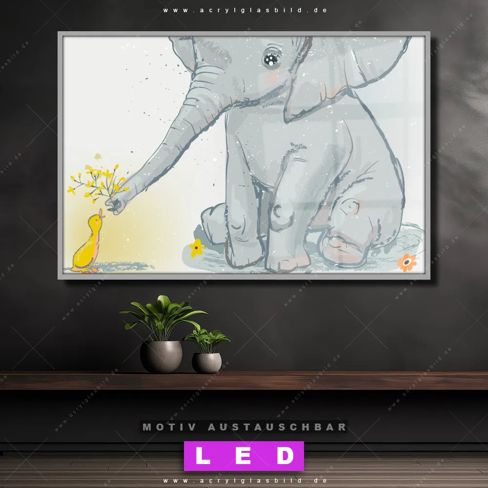 Du bist auf der Suche nach einem dimmbaren Tierwelt LED Bild mit Fernbedienung und optionaler Farbtemperatursteuerung? Dann haben wir hier genau das richtige Wandbild mit LED Beleuchtung für dich: Unser Canvalight® DIA LED Acrylglasbild Elefant & Entlein im Querformat mit austauschbarer bedruckter Acrylglas-Scheibe. Dieses Leuchtbild bringt sofort Partybeleuchtung in deine Räume!