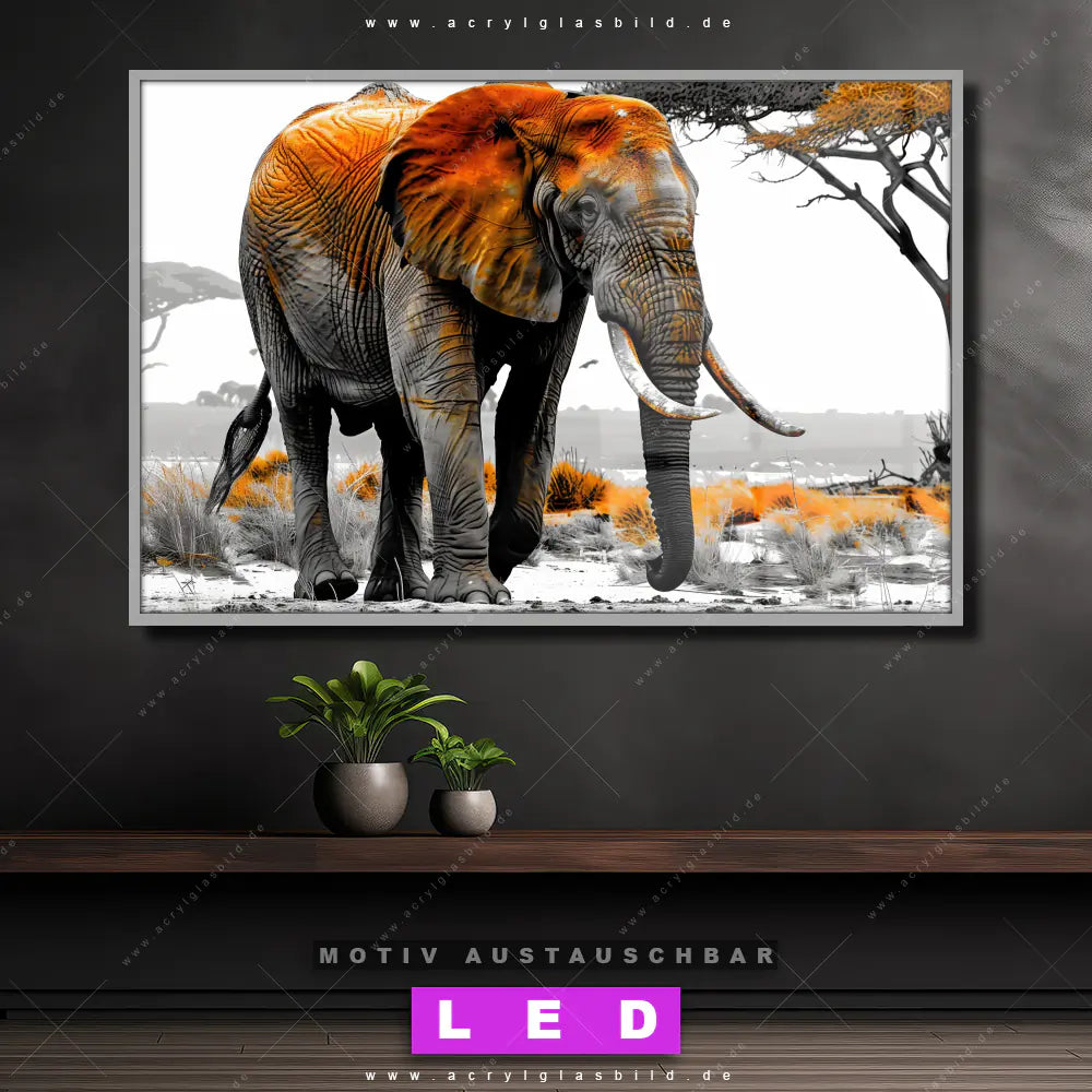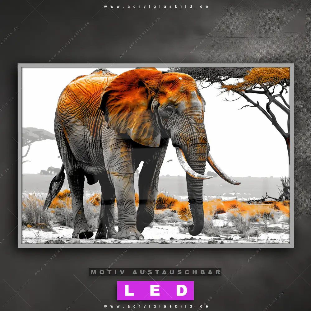 Mit unserem LED Acrylglasbild Canvalight® DIA Majestätischer Elefant und seiner genialen LED-Ausleuchtung wirst du nie wieder im Dunkeln auf deinem Sofa herumtappen. Wenn du nach einem beleuchteten Wandbild aus Acrylglas mit Elefant, Afrika, wild, Safari, Savanne, Dickhäuter, Wüste, Stärke, Natur, Freiheit für Wohnzimmer - Schlafzimmer, Flur - Eingangsbereich, Büro - Kanzlei suchst, ist unser LED Leuchtbild Elefant in der Savanne in den beeindruckenden Motiv-Farben Braun, Grau , Beige, Weiss genau das richtige beleuchtete Wandbild für dich. Gestaltet im Grunge, Modern Art, Retro - Vintage Stil, passt dieses LED Wandbild mit DIA-Klapprahmen und glänzender Front aus Acrylglas perfekt zu jedem Einrichtungsstil – sogar zu deinem chaotischen kreativen Durcheinander!