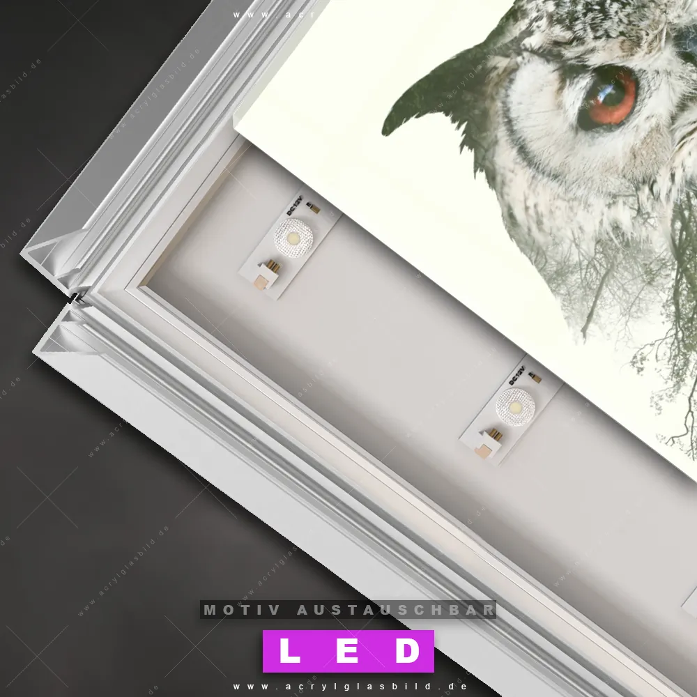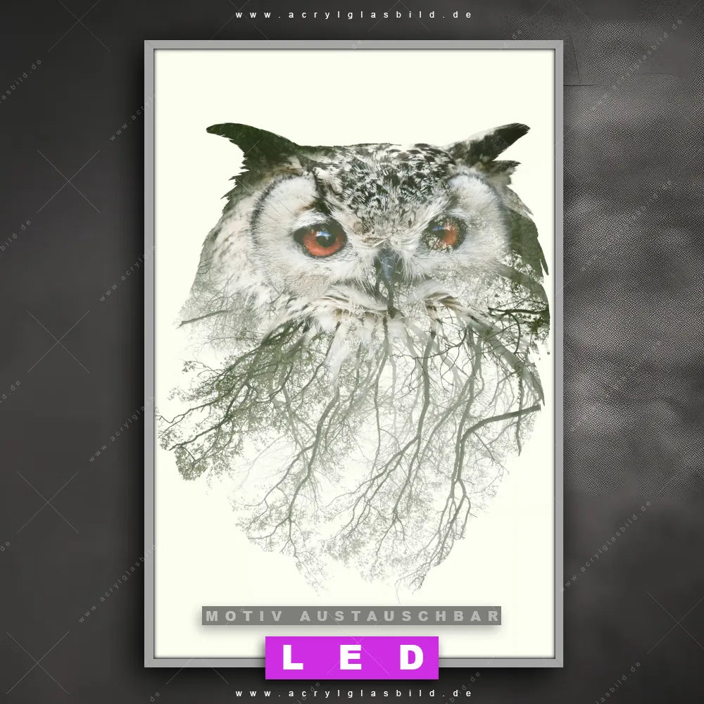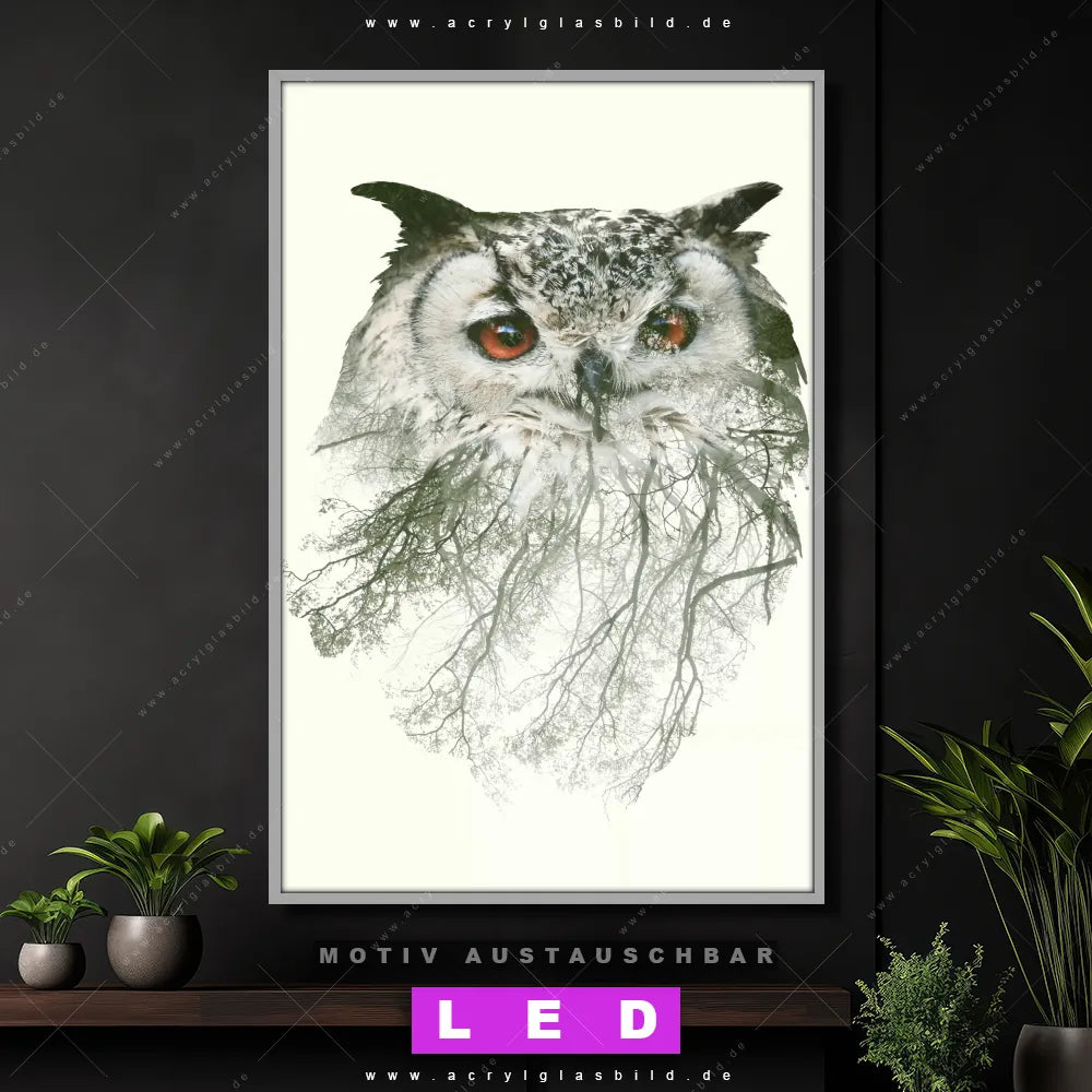 Du suchst nach einem Wandbild mit LED Beleuchtung als ultimativen Hingucker für deine Wände? Dann haben wir das perfekte dimmbare LED Bild mit Fernbedienung und optionaler Farbtemperatursteuerung für dich: unser abgefahrenes Tierwelt Canvalight® DIA LED Acrylglasbild! Mit dem LED Leuchtbild aus Acrylglas Eule & Wald No.1 im Hochformat mit austauschbarer bedruckter Acrylglas-Scheibe bringst du nicht nur Licht, sondern auch ordentlich Stil in deine Bude.