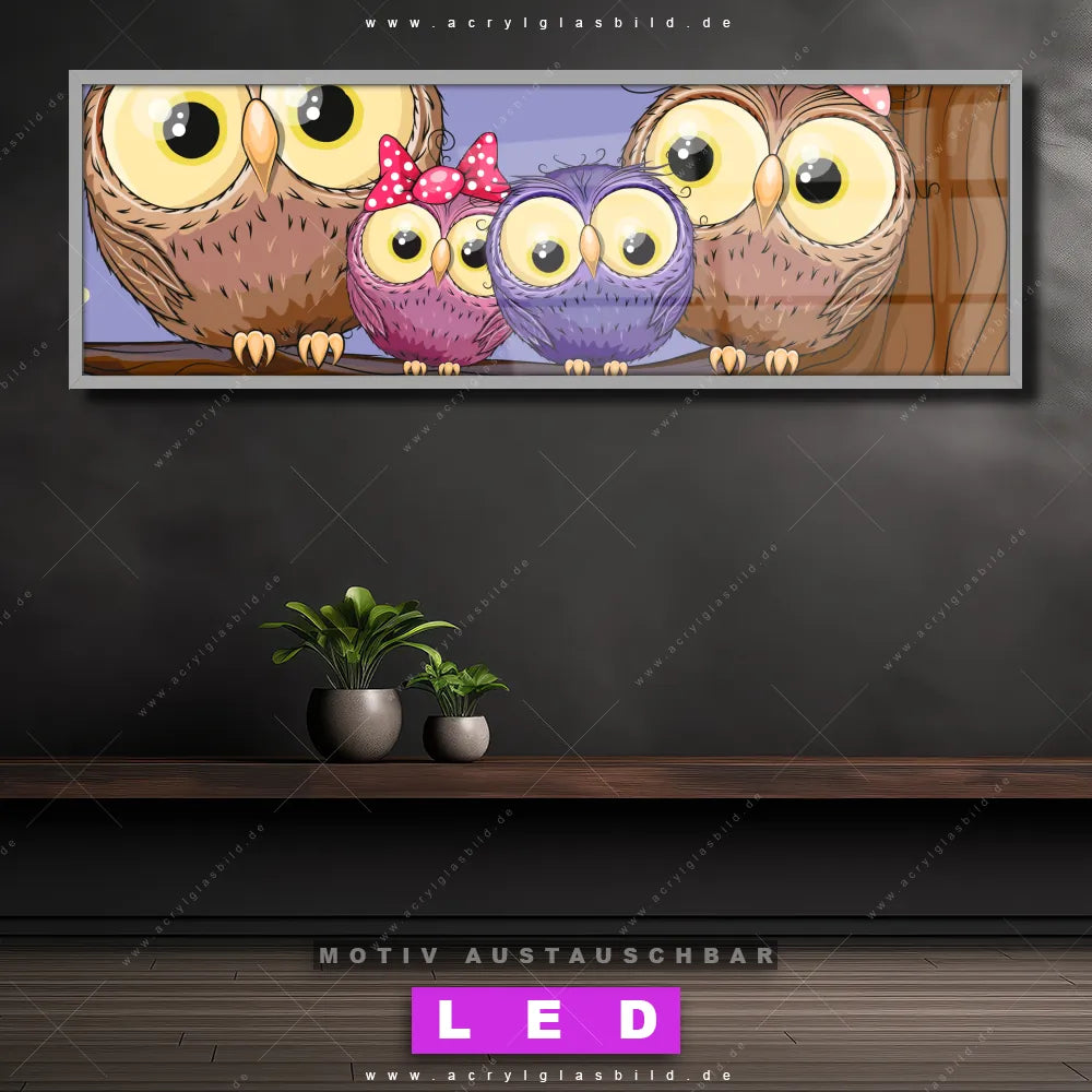 Deine Wände könnten dringend ein dimmbares LED Bild mit Fernbedienung und optionaler Farbtemperatursteuerung gebrauchen? Dann haben wir das perfekte Wandbild mit LED Beleuchtung für dich: unser mega-cooles Tierwelt Canvalight® DIA LED Acrylglasbild! Mit unserem angesagten Leuchtbild aus Acrylglas im Panorama-Format und der austauschbaren bedruckten Acrylglas-Scheibe Eulenfamilie bringst du nicht nur Licht, sondern auch jede Menge Flair in deine Räume.