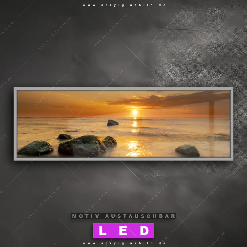 Wer will schon dunkle, triste Wände? Mit unserem LED Acrylglasbild Canvalight® DIA Steine im Sonnenmeer und seiner fantastischen LED-Ausleuchtung werden deine Wände in Arzt - Praxis, Büro - Kanzlei, Wohnzimmer - Schlafzimmer zu echten Hinguckern. Wenn du auf der Suche nach einem beleuchteten Wandbild aus Acrylglas mit Felsen, Sommer, Deutschland, Steine, Ostsee, Nordsee, Sonnenaufgang, Urlaub, Abenddämmerung bist, dann solltest du unser LED Leuchhtbild Goldene Wellen der Stille mit den beeindruckenden Motiv-Farben Orange, Braun, Beige nicht verpassen. Gestaltet im angesagten Natürlich - Realistisch, Modern Art Stil, passt das LED Bild mit DIA-Klapprahmen und wechselbarer Acrylglas-Scheibe perfekt zu jedem Einrichtungsstil – selbst in deinem kleinen Dschungel aus Kreativität und Chaos!