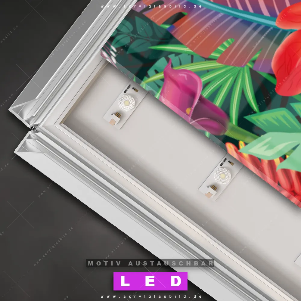 Deine Wände könnten dringend ein dimmbares LED Bild mit Fernbedienung und optionaler Farbtemperatursteuerung gebrauchen? Dann haben wir das perfekte Wandbild mit LED Beleuchtung für dich: unser mega-cooles Blumen - Botanik Canvalight® DIA LED Acrylglasbild! Mit unserem angesagten Leuchtbild aus Acrylglas im Panorama-Format und der austauschbaren bedruckten Acrylglas-Scheibe Exotische Tropenpflanzen bringst du nicht nur Licht, sondern auch jede Menge Flair in deine Räume.