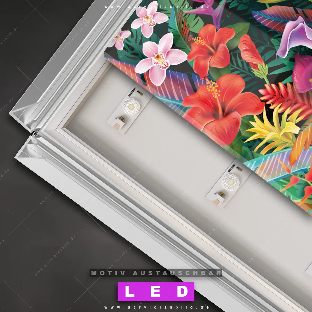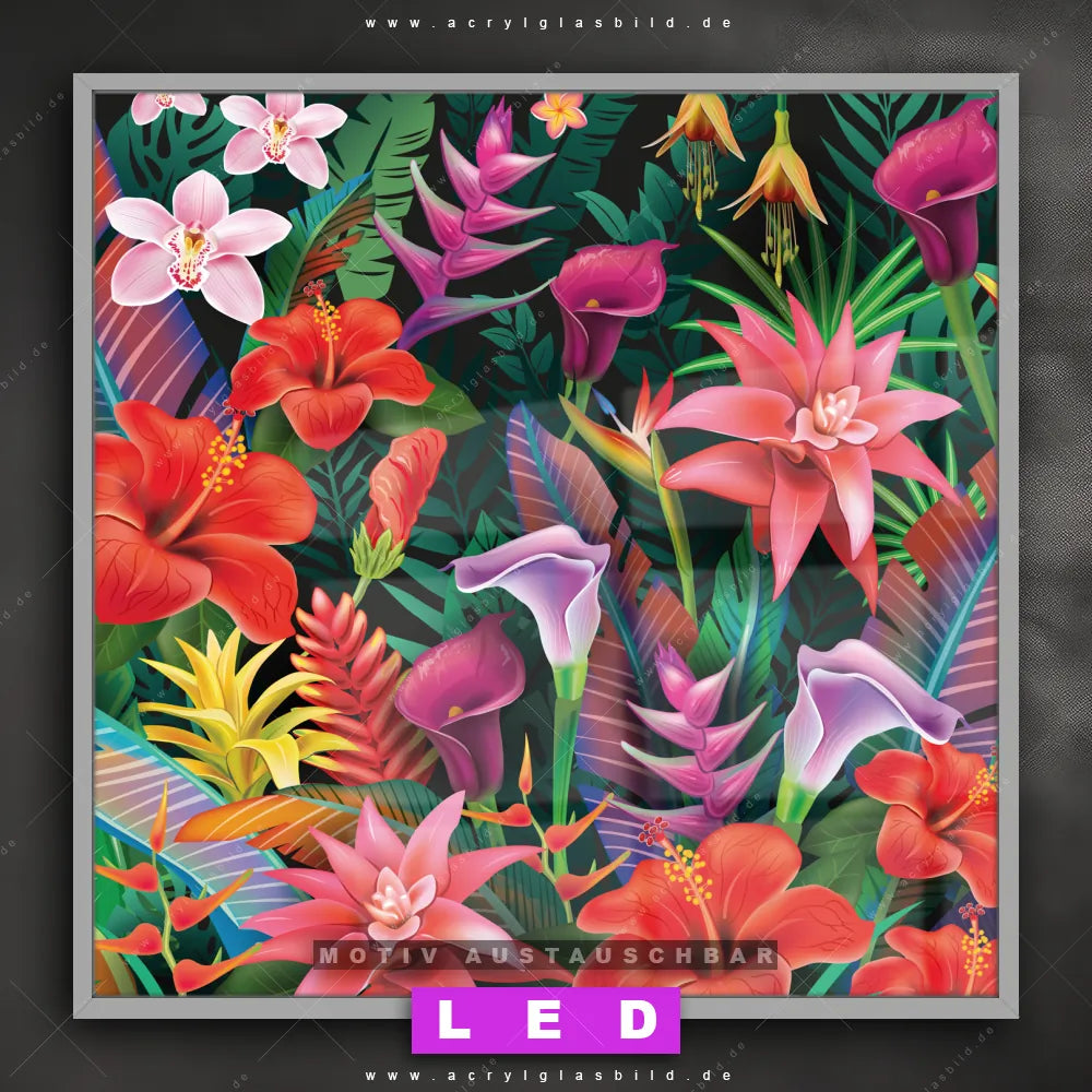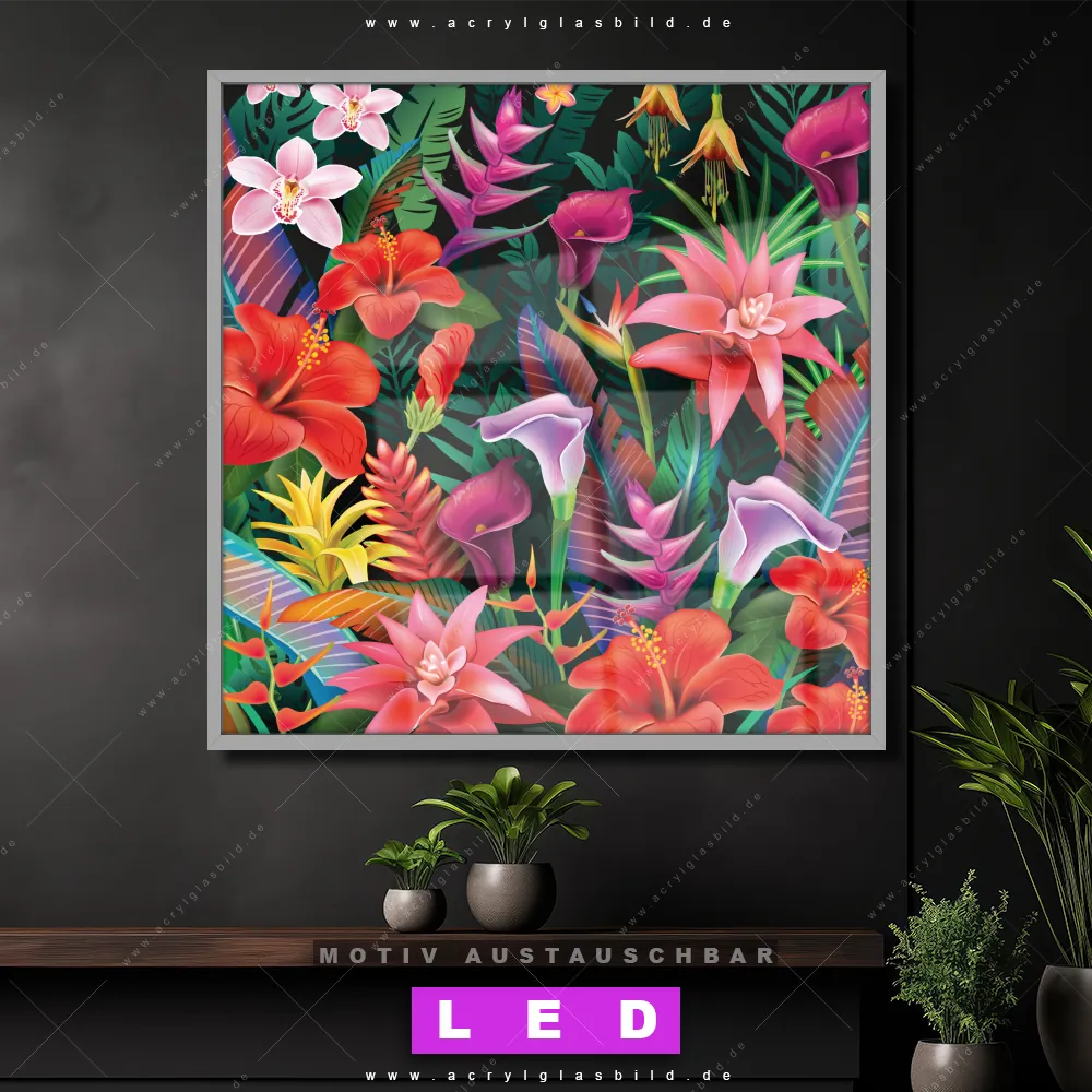 Bist du bereit, deine Wände mit einem dimmbaren LED Bild mit Fernbedienung und optionaler Farbtemperatursteuerung zum Leuchten zu bringen? Wir haben das ultimative Blumen - Botanik LED Acrylglasbild Canvalight® DIA für dich! Unser LED Wandbild aus Acrylglas Exotische Tropenpflanzen im Quadratischen Format mit austauschbarer bedruckter Acrylglas-Scheibe im DIA-Klapprahmen bringt sofort jede Menge Glanz in deine vier Wände.