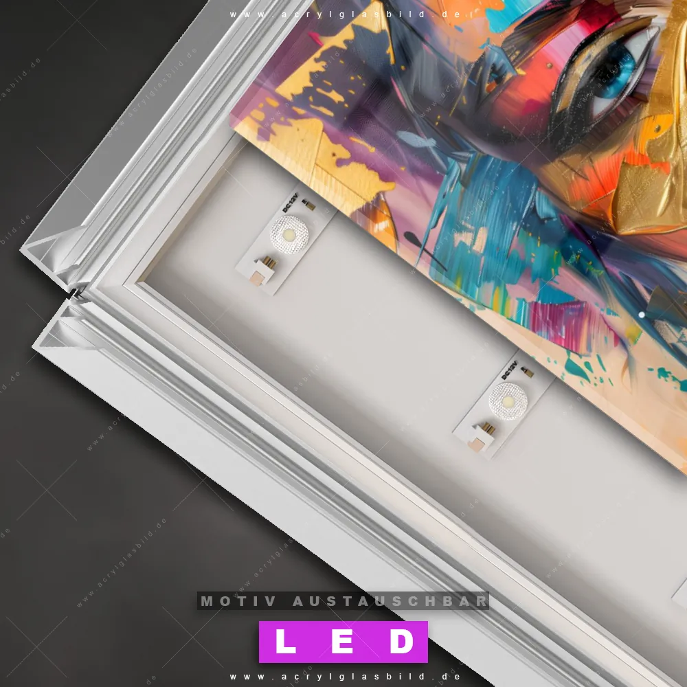 Wer braucht schon langweilige Wände, wenn man sie mit unserem LED Acrylglasbild Canvalight® DIA Abstrakte Schönheit aufpeppen kann? Dank der genialen LED-Ausleuchtung wirst du in Friseur - Beauty, Wohnzimmer - Schlafzimmer, Flur - Eingangsbereich nie wieder über deine eigenen Füße stolpern. Wenn du nach einem beleuchteten Wandbild aus Acrylglas mit Porträt, Frau, Gesicht, Farbexplosion, Farbspritzer, Frauenporträt suchst, dann ist unser LED Acrylglasbild Moderne Kunstvision einer Frau in den hammermäßigen Motiv-Farben Bunt, Orange, Blau, Pink, Gold genau das richtige LED Bild für dich. Im coolen Abstrakt, Modern Art Stil gestaltet, passt das LED Leuchtbild mit DIA-Klapprahmen und glänzender Front aus Acrylglas perfekt zu jedem Einrichtungsstil – sogar zu deinem chaotischen Kreativlabor!