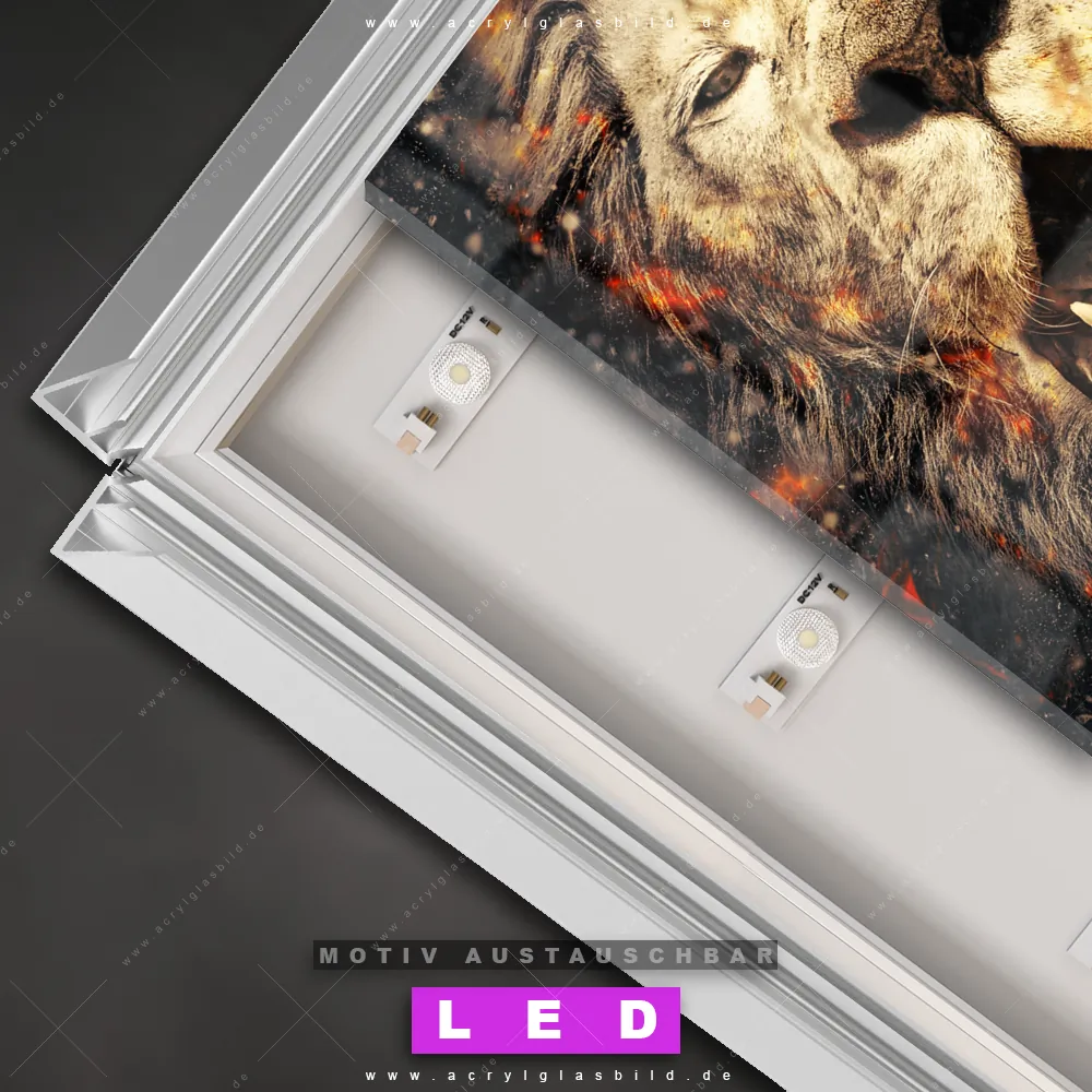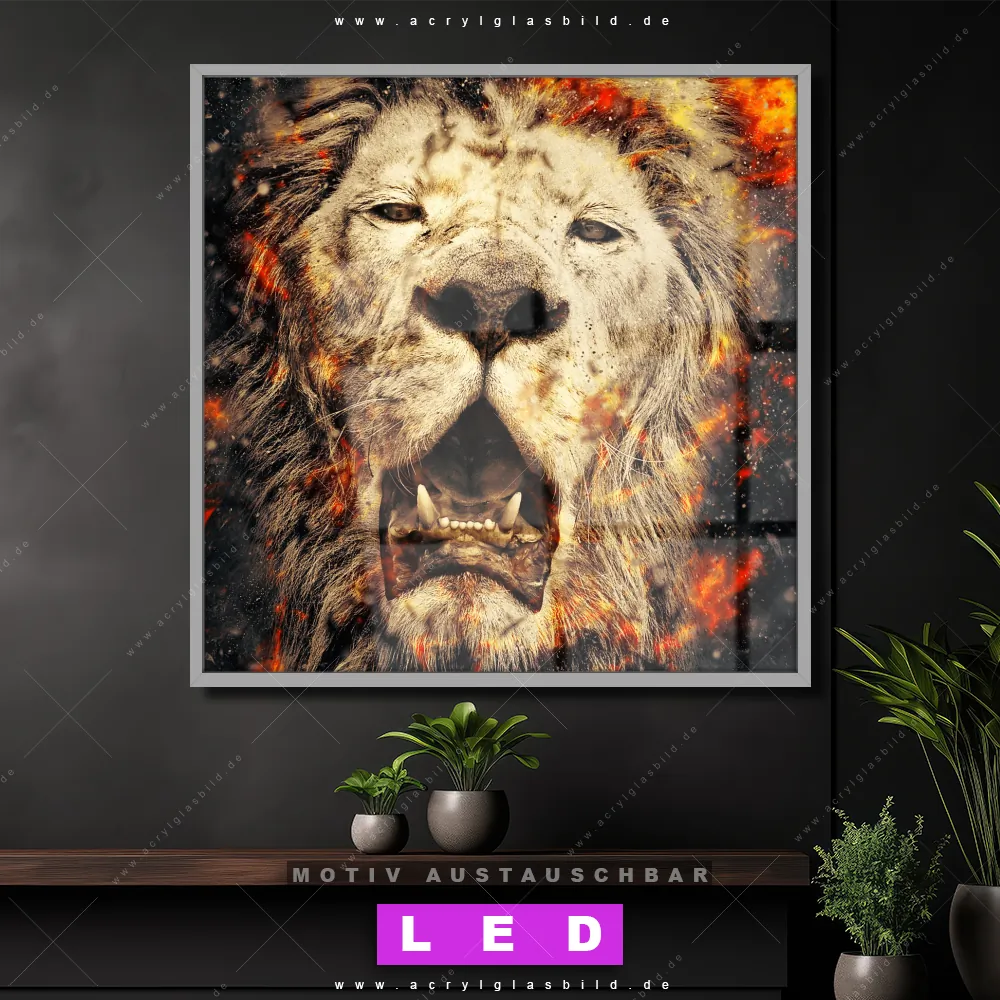 Bist du bereit, deine Wände mit einem dimmbaren LED Bild mit Fernbedienung und optionaler Farbtemperatursteuerung zum Leuchten zu bringen? Wir haben das ultimative Tierwelt LED Acrylglasbild Canvalight® DIA für dich! Unser LED Wandbild aus Acrylglas Feuer Löwe im Quadratischen Format mit austauschbarer bedruckter Acrylglas-Scheibe im DIA-Klapprahmen bringt sofort jede Menge Glanz in deine vier Wände.