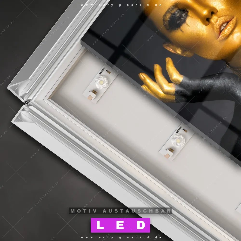 Also, worauf wartest du noch? Gib mit einem beleuchteten Wandbild mit wechselbarer Acrylglas-Scheibe deinen Wänden das gewisse Etwas und bestelle jetzt das LED Acrylglasbild Canvalight® DIA Sinnlichkeit in schwarz-gold – dein Zuhause wird es dir danken und deine Freunde werden dank der wechselbaren Motive erblassen!
