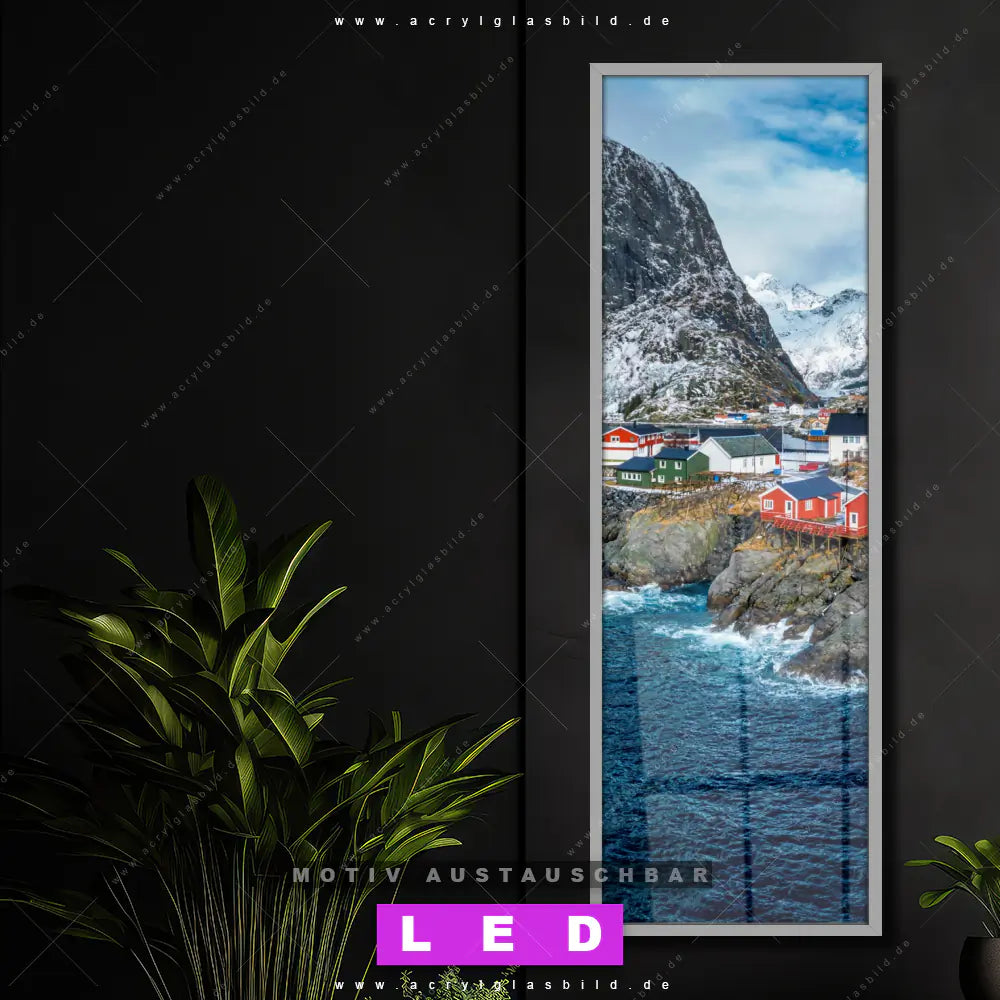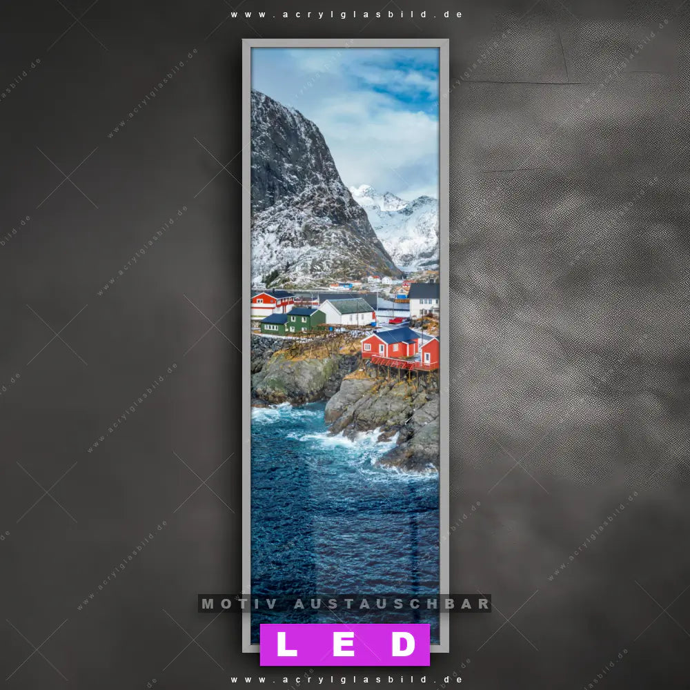 Begriffe wie Skandinavien, Norwegen, See, Natur, Dorf, Steg, Fjord, Winter, Meer, Häuser, Berge haben dich auf der Suche nach deinem neuen LED Wandbild aus Acrylglas inspiriert? Dann sollte das LED Acrylglasbild Skandinavische Küste den Weg zu dir finden.