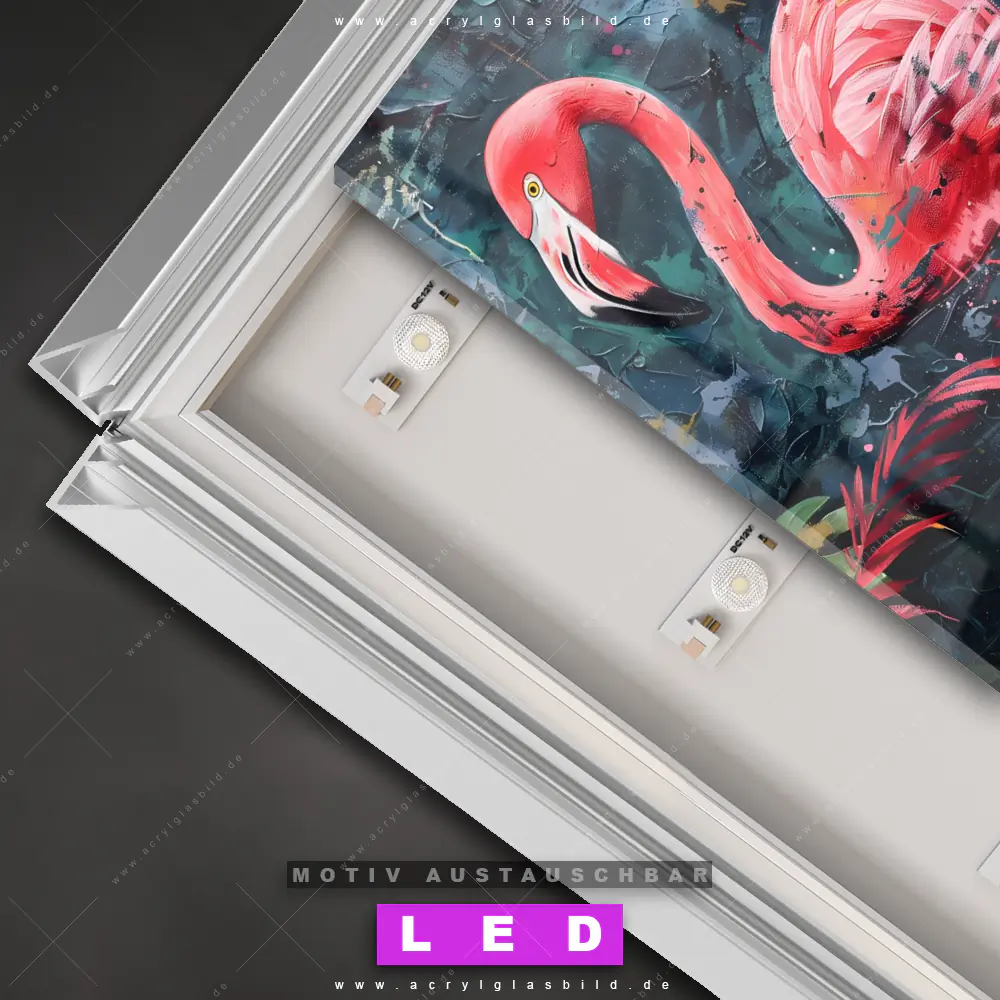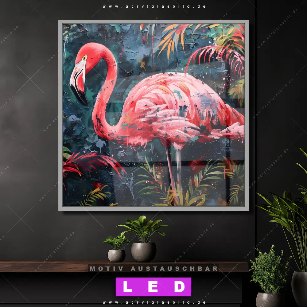 Bist du bereit, deine Wände mit einem dimmbaren LED Bild mit Fernbedienung und optionaler Farbtemperatursteuerung zum Leuchten zu bringen? Wir haben das ultimative Tierwelt, Blumen - Botanik LED Acrylglasbild Canvalight® DIA für dich! Unser LED Wandbild aus Acrylglas Flamingo - Dschungel Eleganz im Quadratischen Format mit austauschbarer bedruckter Acrylglas-Scheibe im DIA-Klapprahmen bringt sofort jede Menge Glanz in deine vier Wände.