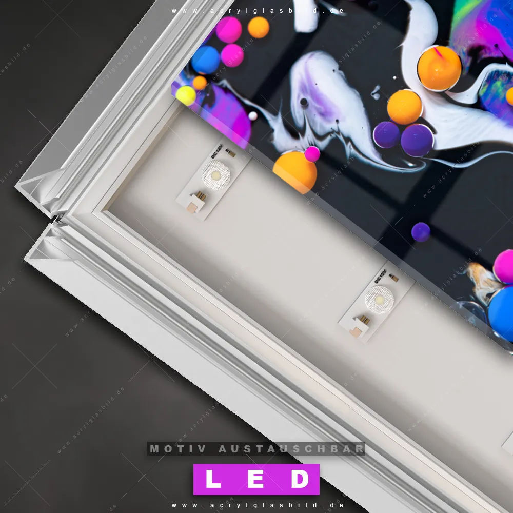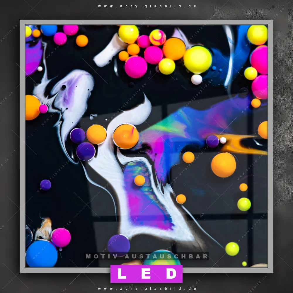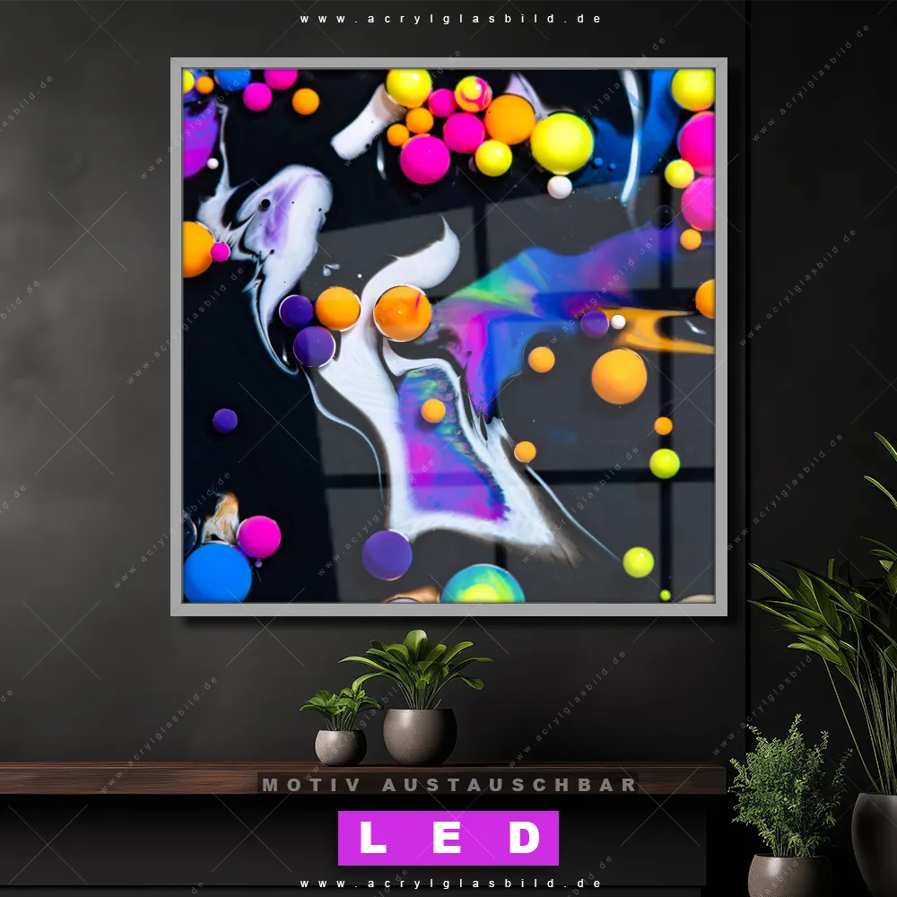 Vergiss dunkle Ecken und Langeweile! Mit unserem Acrylglasbild Farbkugeln und seiner brillanten LED-Ausleuchtung wirst du dich nie wieder in der Dunkelheit verirren. Wenn du auf der Suche nach einem beleuchteten Wandbild aus Acrylglas mit Flüssigkeit, Acryl, flüssig, Farbe, Tropfen, Blasen, Kunst, Tinte, Fluid Art bist, ist unser LED Acrylglasbild Canvalight® DIA Bunte Kugeln mit den strahlenden Motiv-Farben Pink, Schwarz, Orange, Blau, Lila genau das richtige Leuchtbild für dich. Das im Abstrakt, Modern Art Stil gestaltete LED Bild mit glänzender Front aus Acrylglas passt perfekt zu jedem Einrichtungsstil in Arzt - Praxis, Büro - Kanzlei, Wohnzimmer - Schlafzimmer, Bar - Gastronomie, Friseur - Beauty – vom minimalistischen Chic bis zum kreativen Chaos.