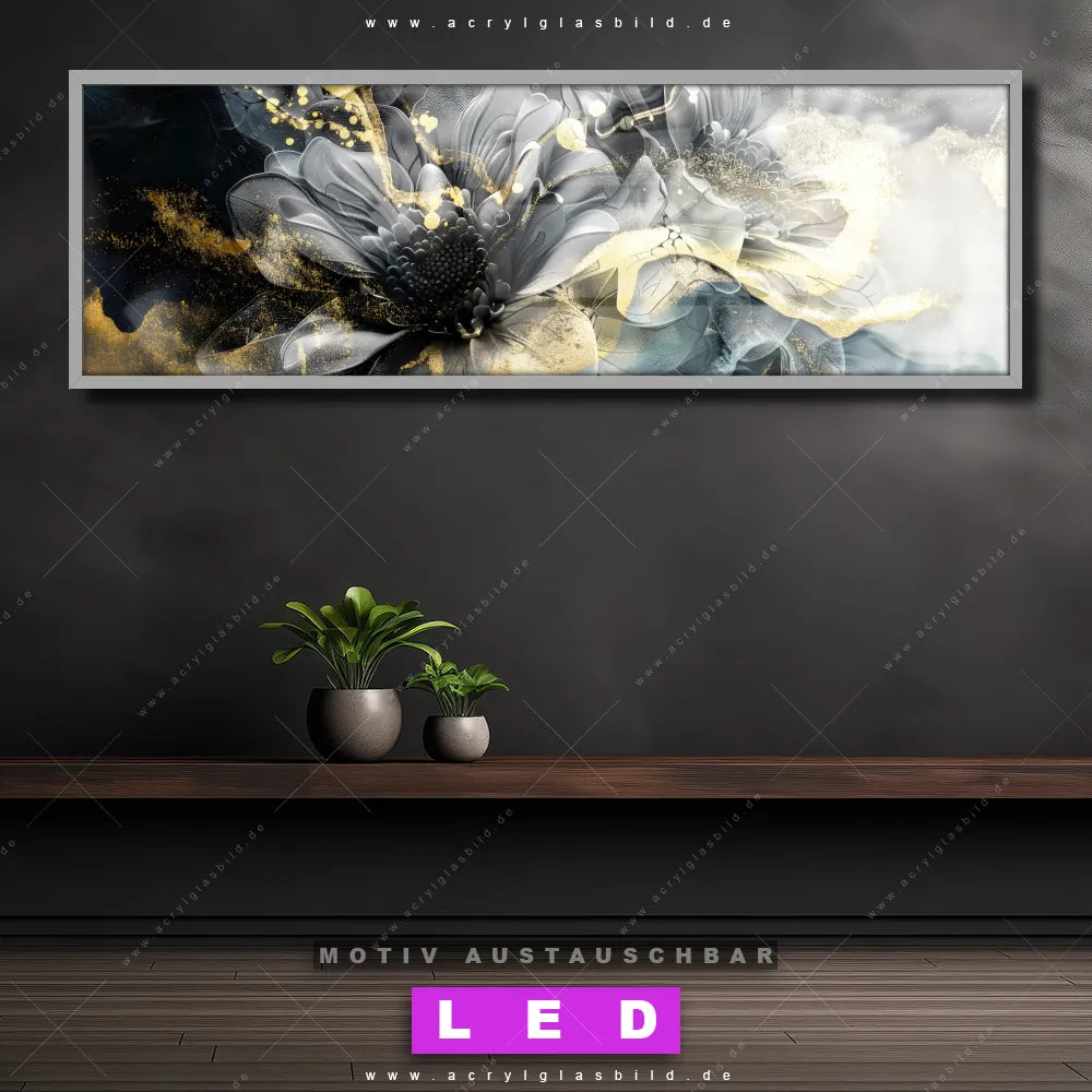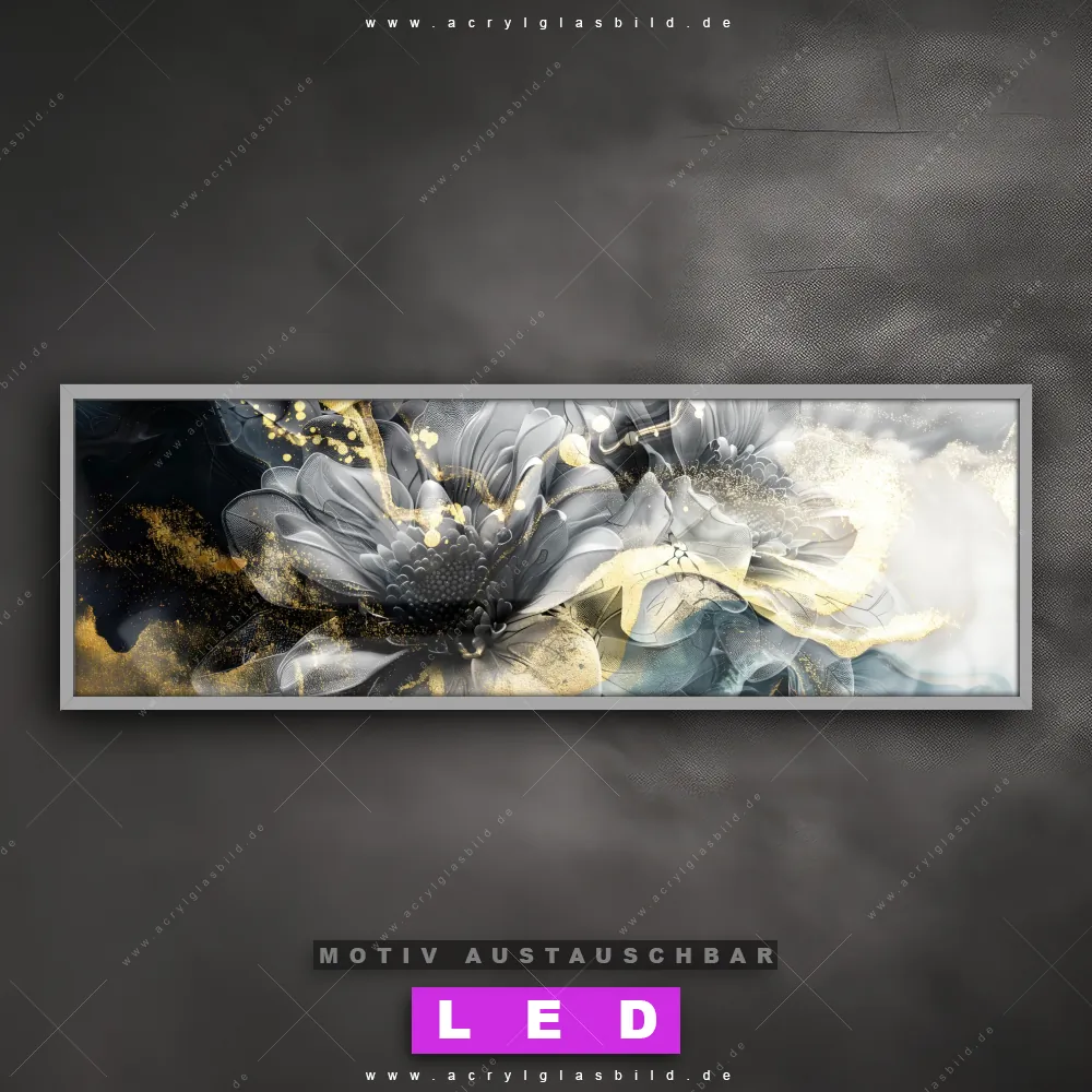 Wer will schon dunkle, triste Wände? Mit unserem LED Acrylglasbild Canvalight® DIA Dunkle Blumen und seiner fantastischen LED-Ausleuchtung werden deine Wände in Wohnzimmer - Schlafzimmer, Arzt - Praxis, Flur - Eingangsbereich zu echten Hinguckern. Wenn du auf der Suche nach einem beleuchteten Wandbild aus Acrylglas mit Blumen, Pflanze, Natur, Blüten, Glitzer, Farbspritzer, Fluid Art bist, dann solltest du unser LED Leuchhtbild Florales abstraktes Design mit den beeindruckenden Motiv-Farben Schwarz, Grau , Gold, Türkis nicht verpassen. Gestaltet im angesagten Abstrakt, Floral, Modern Art Stil, passt das LED Bild mit DIA-Klapprahmen und wechselbarer Acrylglas-Scheibe perfekt zu jedem Einrichtungsstil – selbst in deinem kleinen Dschungel aus Kreativität und Chaos!