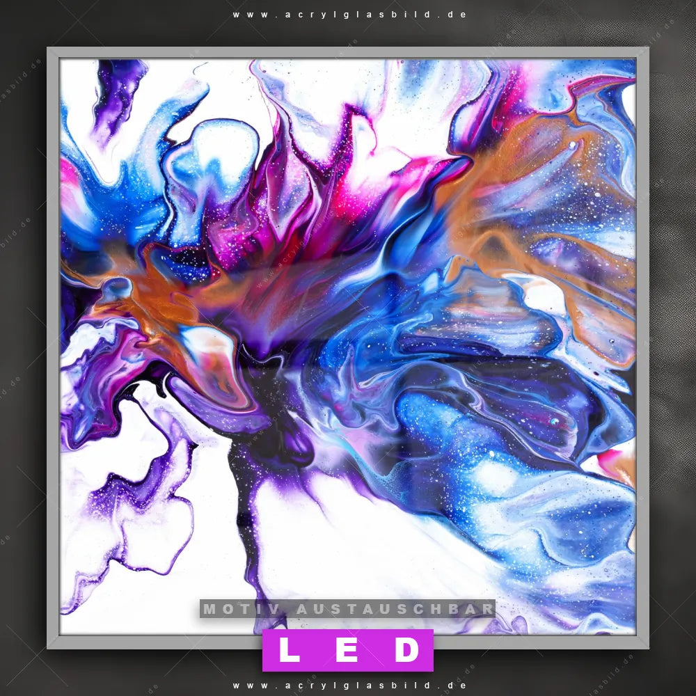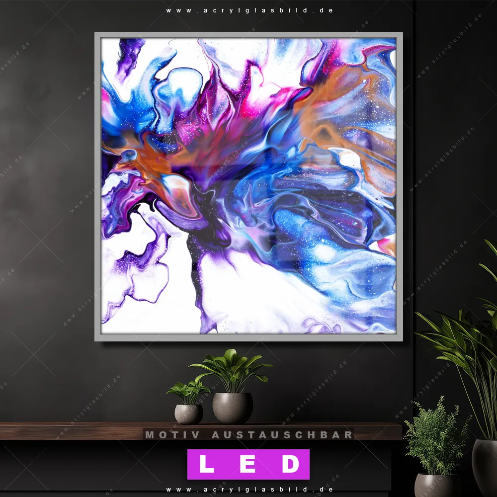 Bist du bereit, deine Wände mit einem dimmbaren LED Bild mit Fernbedienung und optionaler Farbtemperatursteuerung zum Leuchten zu bringen? Wir haben das ultimative Muster - Texturen LED Acrylglasbild Canvalight® DIA für dich! Unser LED Wandbild aus Acrylglas Fluid Art Floral im Quadratischen Format mit austauschbarer bedruckter Acrylglas-Scheibe im DIA-Klapprahmen bringt sofort jede Menge Glanz in deine vier Wände.