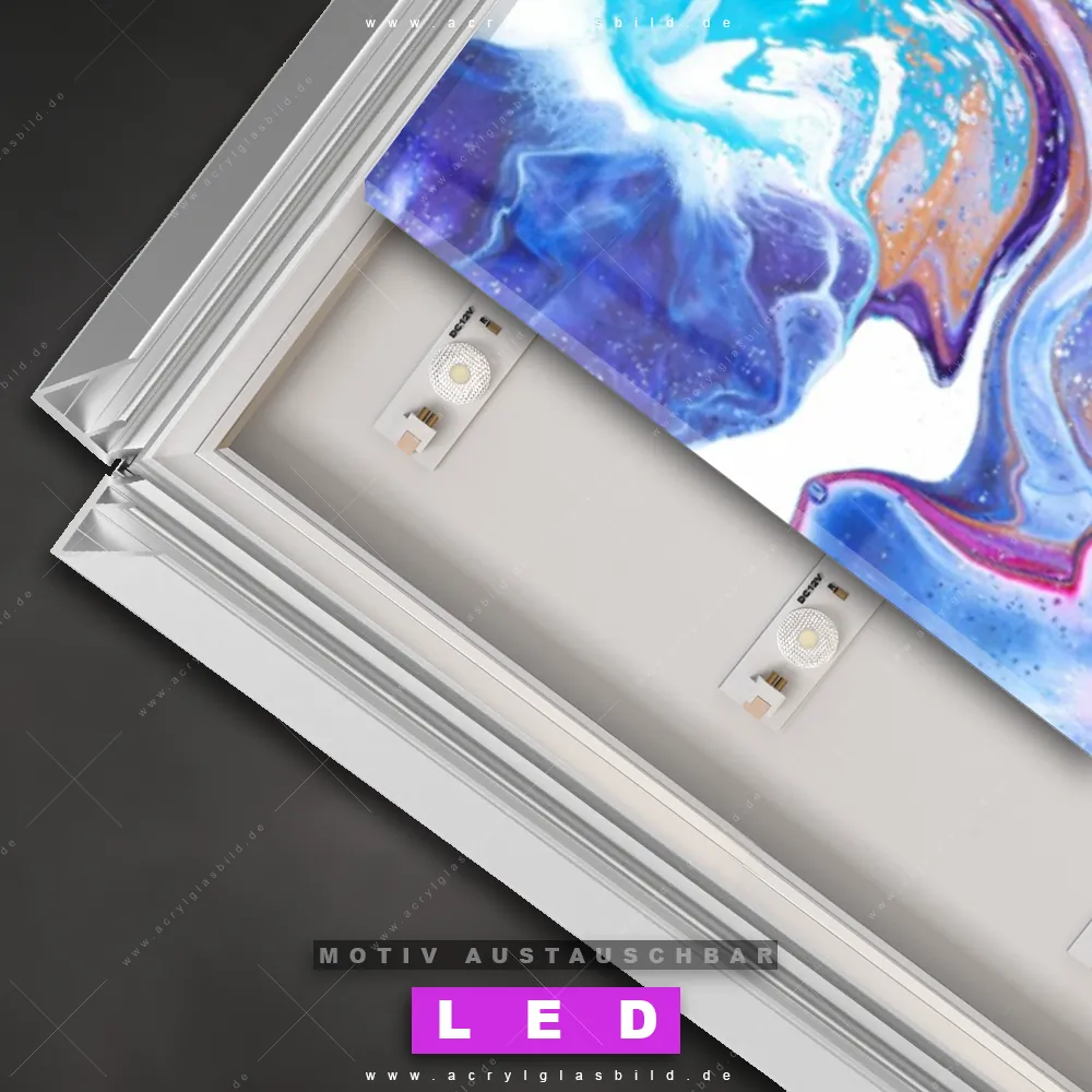 Vergiss dunkle Ecken und langweilige Wände in Arzt - Praxis, Büro - Kanzlei, Wohnzimmer - Schlafzimmer, Bar - Gastronomie, Friseur - Beauty! Mit unserem LED Acrylglasbild Canvalight® DIA Farblauf wirst du nie wieder im Dunkeln tappen. Suchst du nach einem beleuchteten Wandbild mit Flüssigkeit, Acryl, flüssig, Farbe, Marmorierung, Tinte, Alkohol, Fluid Art? Dann ist unser Leuchtbild fließende Farbe mit den strahlenden Motiv-Farben Weiss, Blau, Lila, Türkis genau das richtige LED Bild für dich. Egal, ob dein Stil minimalistisch oder exotisch ist, dieses LED Leuchtbild im Abstrakt, Modern Art Stil mit DIA-Klapprahmen und glänzender Front aus Acrylglas passt perfekt zu jeder Einrichtung.
