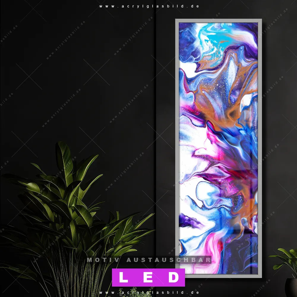 Bist du bereit, deine Wände mit einem dimmbaren LED Bild mit Fernbedienung und optionaler Farbtemperatursteuerung auf das nächste Level zu bringen? Unser Muster - Texturen Canvalight® DIA LED Acrylglasbild ist genau das, was du brauchst! Das Wandbild mit LED Beleuchtung im Schmalen Format mit austauschbarer bedruckter Acrylglas-Scheibe Fluid Art Floral bringt Licht und Stil in dein Zuhause – und das in null Komma nichts!