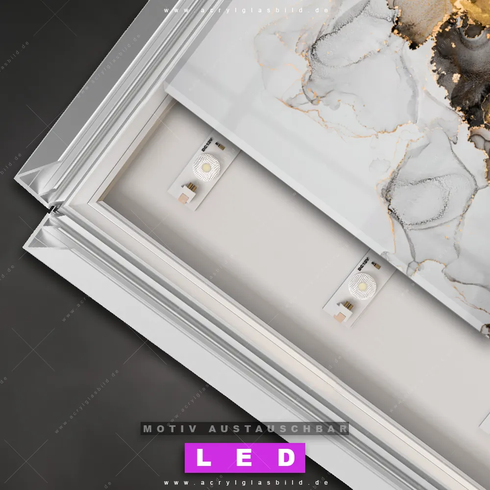 Du bist auf der Suche nach einem dimmbaren Muster - Texturen LED Bild mit Fernbedienung und optionaler Farbtemperatursteuerung? Dann haben wir hier genau das richtige Wandbild mit LED Beleuchtung für dich: Unser Canvalight® DIA LED Acrylglasbild Fluid Art Gold im Querformat mit austauschbarer bedruckter Acrylglas-Scheibe. Dieses Leuchtbild bringt sofort Partybeleuchtung in deine Räume!