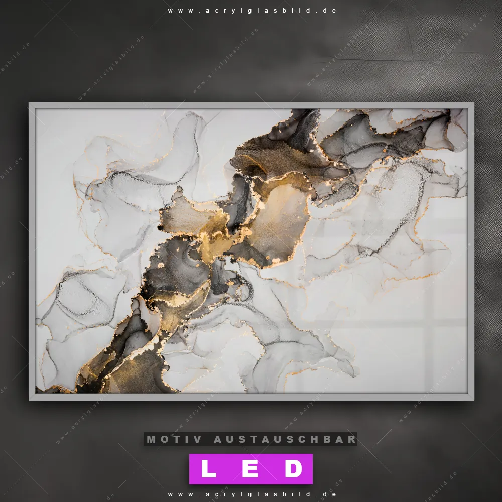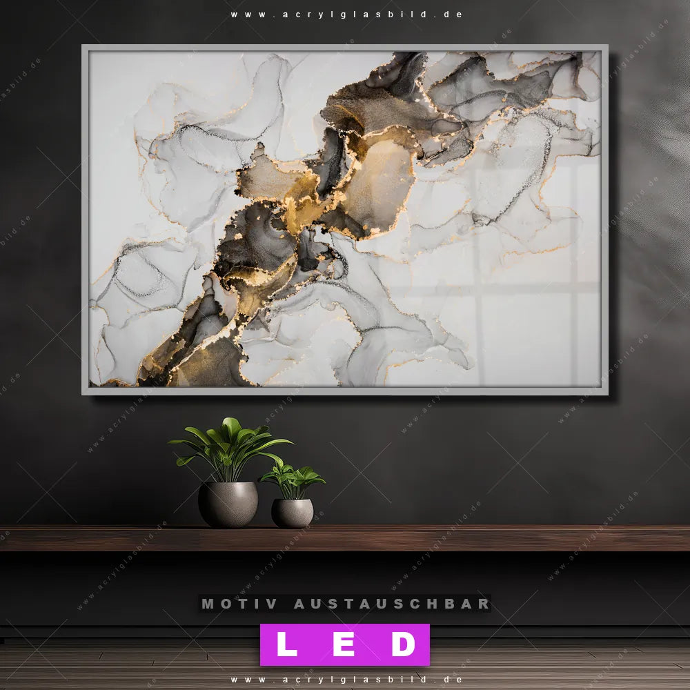 Mit unserem LED Acrylglasbild Canvalight® DIA Marmormuster und seiner genialen LED-Ausleuchtung wirst du nie wieder im Dunkeln auf deinem Sofa herumtappen. Wenn du nach einem beleuchteten Wandbild aus Acrylglas mit Flüssigkeit, Acryl, flüssig, Farbe, Marmorierung, Tinte, Alkohol, Goldader, Fluid Art für Arzt - Praxis, Büro - Kanzlei, Wohnzimmer - Schlafzimmer, Bar - Gastronomie, Friseur - Beauty suchst, ist unser LED Leuchtbild Marmorierungseffekte in den beeindruckenden Motiv-Farben Gold, Weiss, Schwarz genau das richtige beleuchtete Wandbild für dich. Gestaltet im Abstrakt, Modern Art Stil, passt dieses LED Wandbild mit DIA-Klapprahmen und glänzender Front aus Acrylglas perfekt zu jedem Einrichtungsstil – sogar zu deinem chaotischen kreativen Durcheinander!