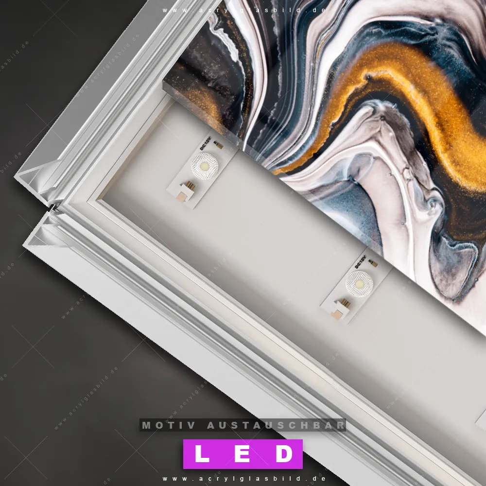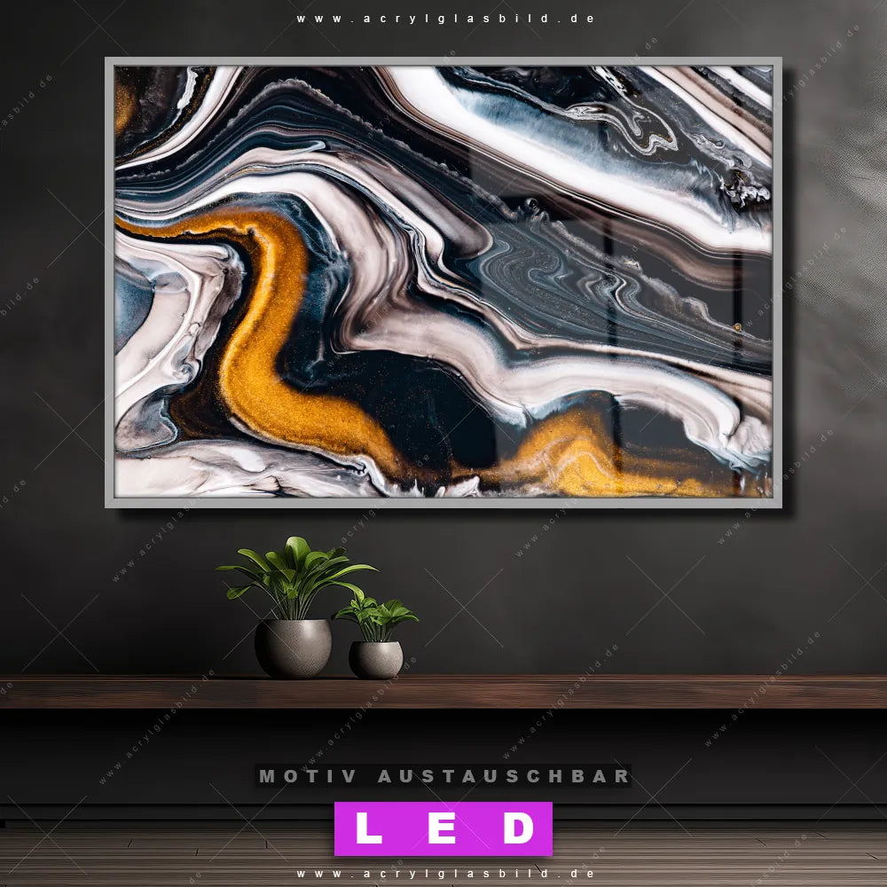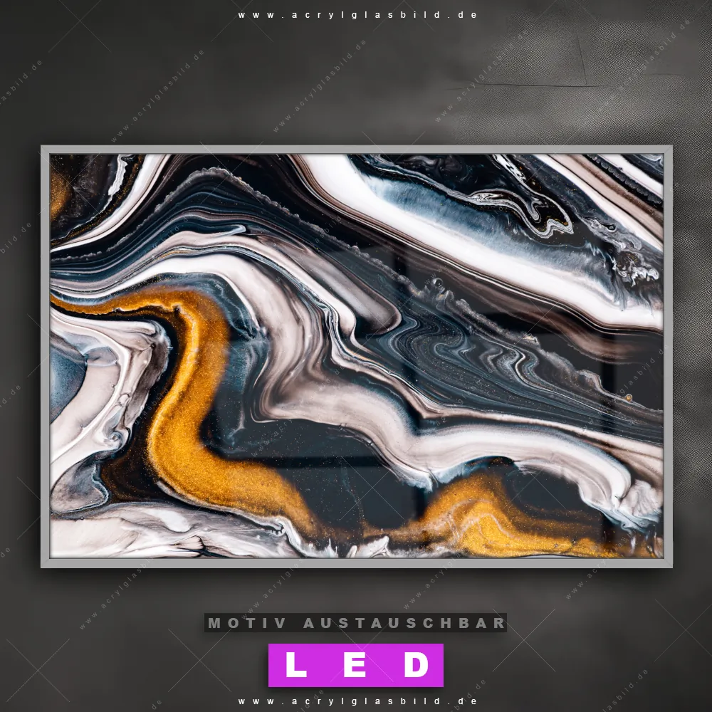 Du bist auf der Suche nach einem dimmbaren Muster - Texturen LED Bild mit Fernbedienung und optionaler Farbtemperatursteuerung? Dann haben wir hier genau das richtige Wandbild mit LED Beleuchtung für dich: Unser Canvalight® DIA LED Acrylglasbild Fluid Art Goldrausch im Querformat mit austauschbarer bedruckter Acrylglas-Scheibe. Dieses Leuchtbild bringt sofort Partybeleuchtung in deine Räume!