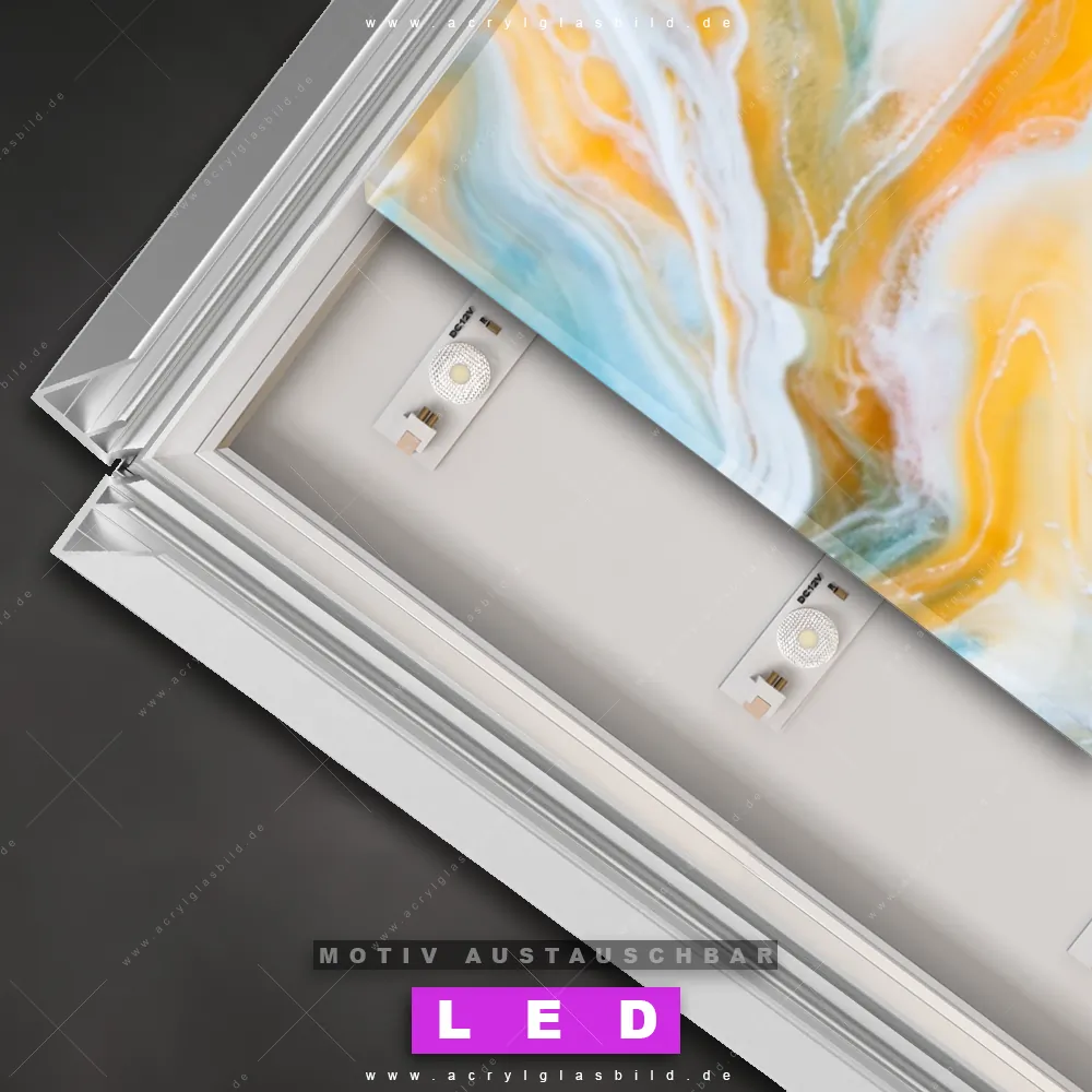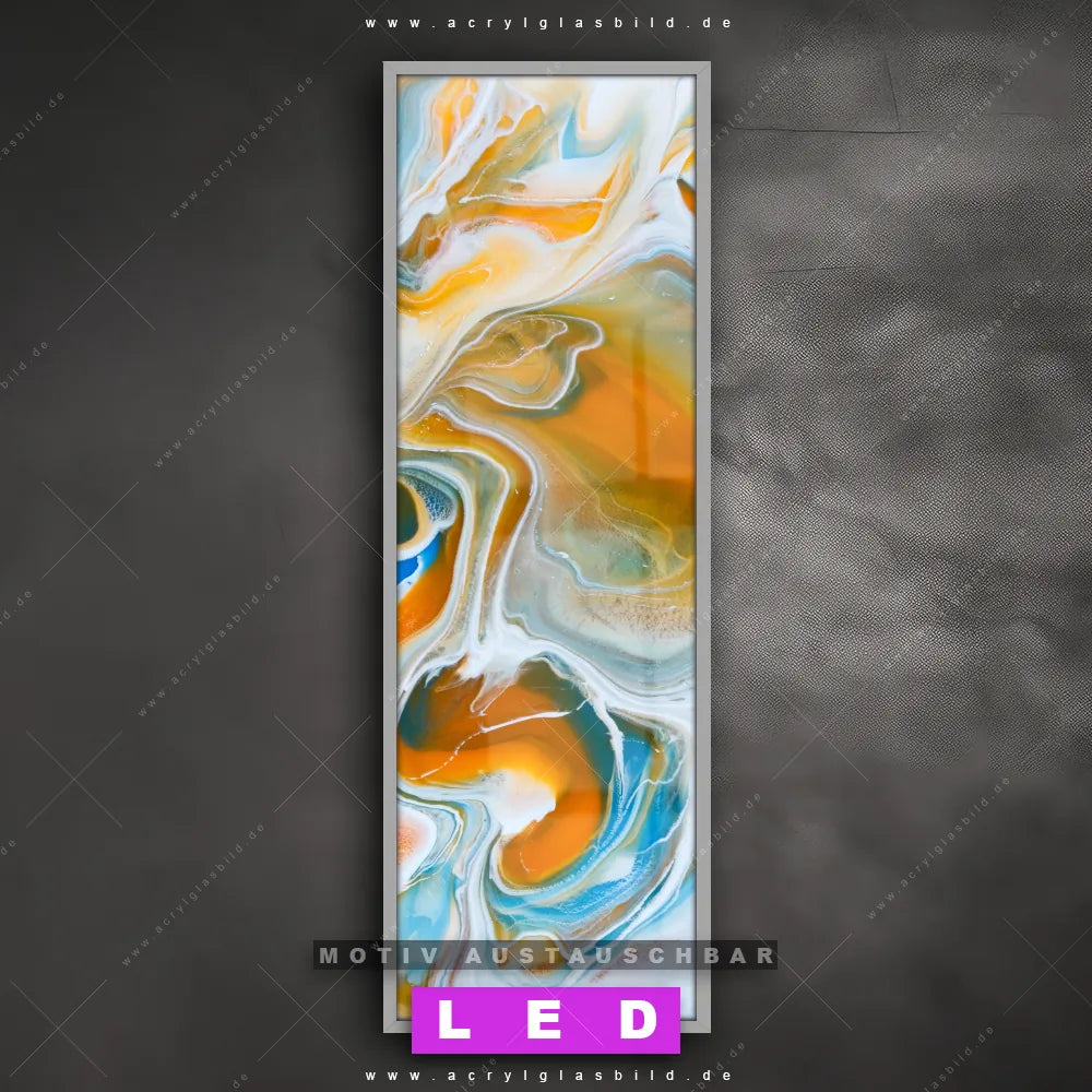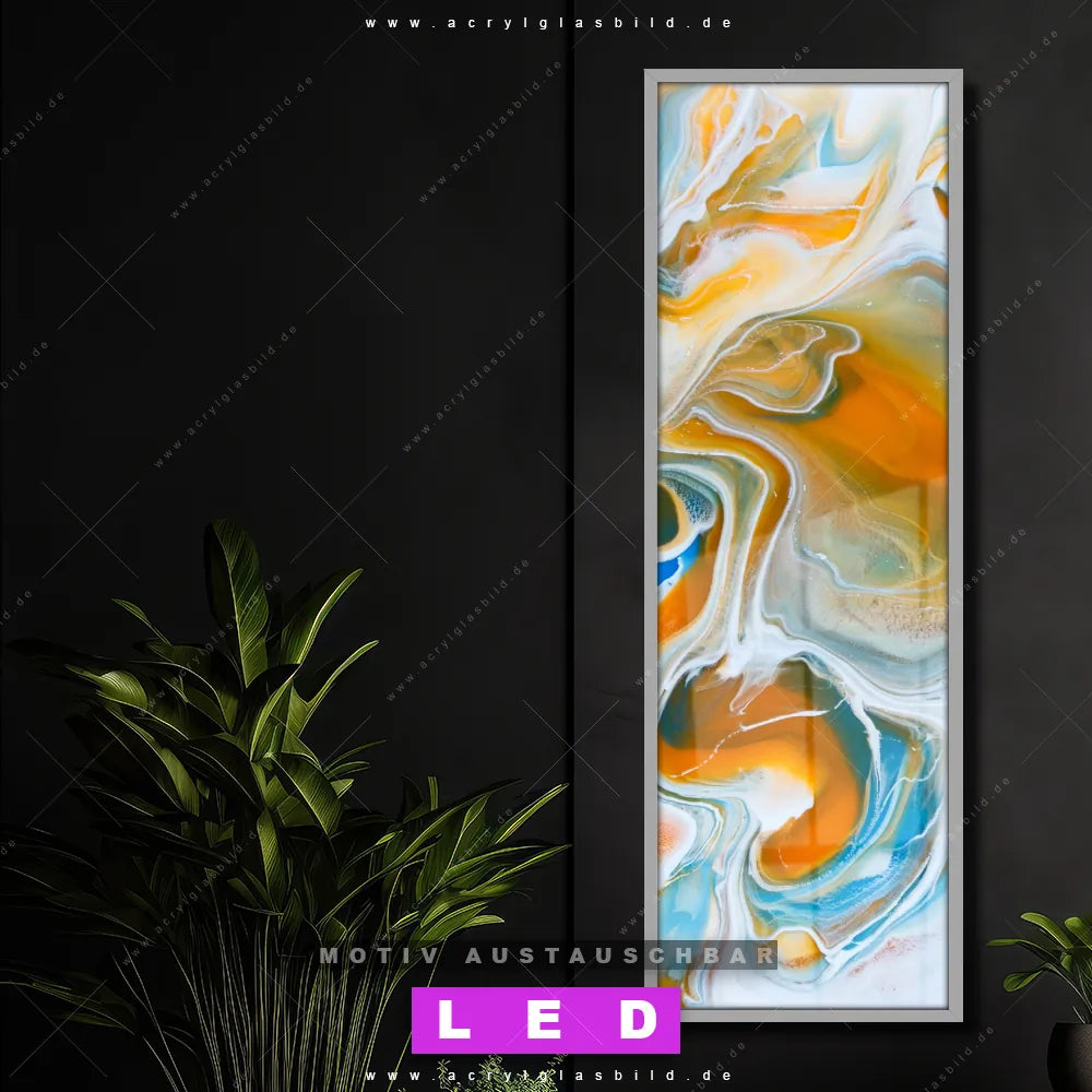 Bist du bereit, deine Wände mit einem dimmbaren LED Bild mit Fernbedienung und optionaler Farbtemperatursteuerung auf das nächste Level zu bringen? Unser Muster - Texturen Canvalight® DIA LED Acrylglasbild ist genau das, was du brauchst! Das Wandbild mit LED Beleuchtung im Schmalen Format mit austauschbarer bedruckter Acrylglas-Scheibe Fluid Art Lagune bringt Licht und Stil in dein Zuhause – und das in null Komma nichts!