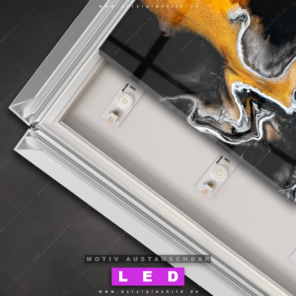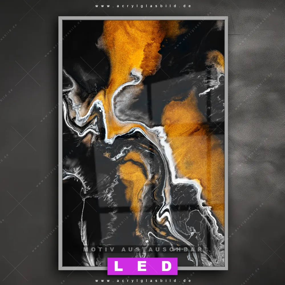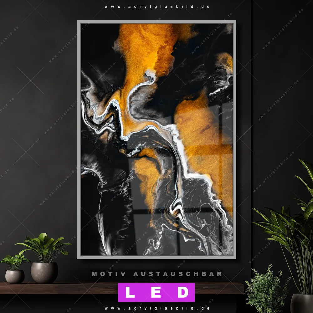 Wer braucht schon langweilige Wände, wenn man sie mit unserem LED Acrylglasbild Canvalight® DIA Farbfluss gold-schwarz aufpeppen kann? Dank der genialen LED-Ausleuchtung wirst du in Arzt - Praxis, Büro - Kanzlei, Wohnzimmer - Schlafzimmer, Bar - Gastronomie, Friseur - Beauty nie wieder über deine eigenen Füße stolpern. Wenn du nach einem beleuchteten Wandbild aus Acrylglas mit Flüssigkeit, Acryl, flüssig, Farbe, Marmorierung, Tinte, Alkohol, Fluid Art suchst, dann ist unser LED Acrylglasbild Fluid Painting Goldstrand im schwarzen Meer in den hammermäßigen Motiv-Farben Schwarz, Orange, Gold genau das richtige LED Bild für dich. Im coolen Abstrakt, Modern Art Stil gestaltet, passt das LED Leuchtbild mit DIA-Klapprahmen und glänzender Front aus Acrylglas perfekt zu jedem Einrichtungsstil – sogar zu deinem chaotischen Kreativlabor!