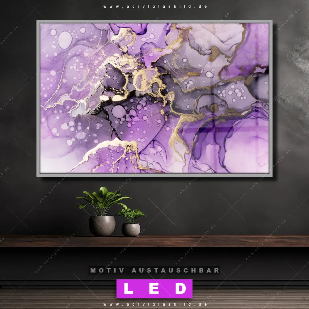 Mit unserem LED Acrylglasbild Canvalight® DIA Fluid Painting lila-gold und seiner genialen LED-Ausleuchtung wirst du nie wieder im Dunkeln auf deinem Sofa herumtappen. Wenn du nach einem beleuchteten Wandbild aus Acrylglas mit Flüssigkeit, Acryl, flüssig, Farbe, Marmorierung, Tinte, Alkohol, Fluid Art für Arzt - Praxis, Büro - Kanzlei, Wohnzimmer - Schlafzimmer, Bar - Gastronomie, Friseur - Beauty suchst, ist unser LED Leuchtbild fließende Farben lila-gold in den beeindruckenden Motiv-Farben Gold, Lila, Schwarz genau das richtige beleuchtete Wandbild für dich. Gestaltet im Abstrakt, Modern Art Stil, passt dieses LED Wandbild mit DIA-Klapprahmen und glänzender Front aus Acrylglas perfekt zu jedem Einrichtungsstil – sogar zu deinem chaotischen kreativen Durcheinander!