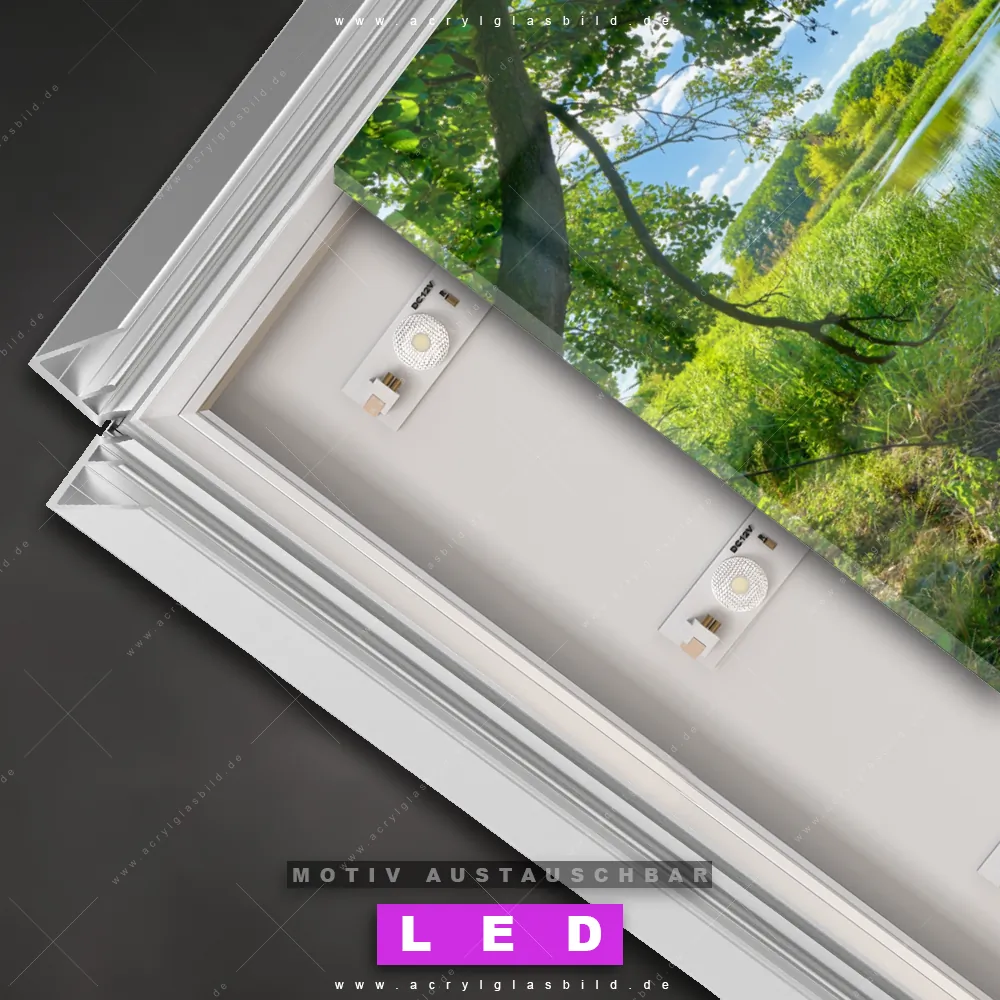 Du bist auf der Suche nach einem dimmbaren Landschaften LED Bild mit Fernbedienung und optionaler Farbtemperatursteuerung? Dann haben wir hier genau das richtige Wandbild mit LED Beleuchtung für dich: Unser Canvalight® DIA LED Acrylglasbild Flusslandschaft im Querformat mit austauschbarer bedruckter Acrylglas-Scheibe. Dieses Leuchtbild bringt sofort Partybeleuchtung in deine Räume!